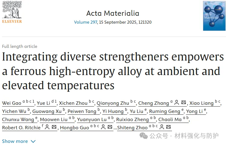 为突破这一瓶颈,近日,北京航空航天大学联合北京科技大学与加州大学伯克利分校在材料领域的国际期刊《Acta Materialia》发表题为“Integrating diverse strengtheners empowers a ferrous high-entropy alloy at ambient and elevated temperatures”的研究性论文,团队基于高熵设计理念,提出了一种“多尺度、多机制协同强化”的新思路,设计出兼具高强度与宽温区适用性的铁基高熵合金Fe-28.2Ni-17Co-11Al-2.5Ta-0.5C-0.04B(at.%)。美国加州大学伯克利分校的Robert O. Ritchie教授与北京航天航空大学天目山实验室的章程研究员、郭洪波教授和赵士腾教授为该论文的通讯作者。
