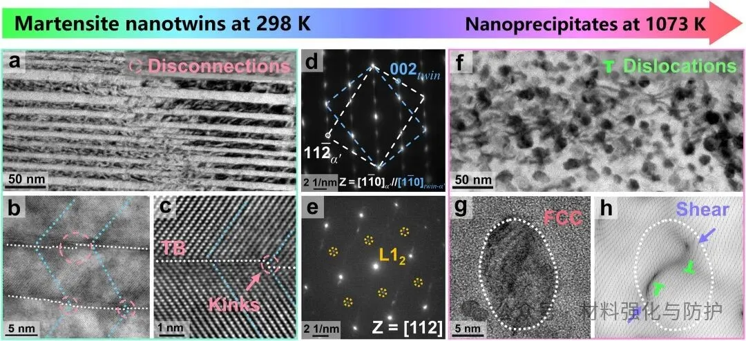 团队计算了混合吉布斯自由能、混合熵和混合热焓,以评价由不同组分组成的热力学稳定性,并进行了进一步的参数计算最终确定了合金的成分,随后根据CALPHAD模拟结果,利用Thermo-calc和JMatpro软件对合金的平衡相图和马氏体相变进行了分析。合金铸锭在1573K下进行3h的均匀化处理并水淬后进行热轧+冷轧减薄,随后在1473K下进行10min的退火处理,水淬后在液氮中48h,取出返回室温后在873K下退火2h,然后再次水淬。针对制备完成的合金样品,团队通过EBSD、HAADF-STEM、APT、HRTEM等多尺度表征手段,系统揭示了不同强化相的空间分布与原子尺度特征,并通过室温至高温拉伸实验系统评估其宽温区的力学响应。