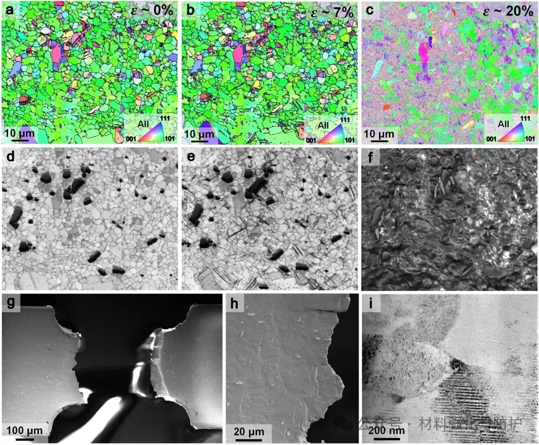 在室温变形条件下,该合金依次经历位错滑移→孪晶形核→应变诱导马氏体相变(TRIP)的序列性强化过程。位错滑移在初期提供合金的塑性来源,随后,低堆垛层错能(~60mJ/m²)促进孪晶形成(TWIP),显著提升加工硬化能力,最后,FCC基体中诱发的马氏体(BCC-α′)相变进一步提高强度,最终实现高强-高塑协同。