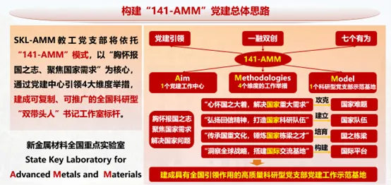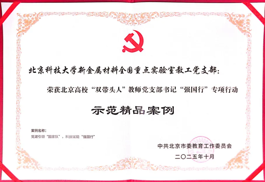 近日 北京高校“双带头人”教师党支部书记 “强国行”专项行动示范案例 遴选结果正式公布 经学校党委推荐和层层选拔 我校新金属材料全国重点实验室教工党支部 从92所高校的233个案例中脱颖而出 入围20个示范案例并参加示范案例交流展示会 以前十名的优异成绩 荣获“示范精品案例”称号 新金属材料全国重点实验室教工党支部 成立于1991年 第一任党支部书记由陈国良院士亲自担任 党支部现有党员48人 其中国家重大人才工程入选者23人次 支部入选第三批 全国高校“双带头人”教师党支部书记工作室 全国高校“双带头人”教师党支部书记 “强国行”专项行动团队 支部结合科研型党支部特点 坚持“国家队干国家事” 构建“141-AMM”党建总体思路 围绕1个 “胸怀报国之志、聚焦国家需求、解决国家问题” 的党建工作中心(1-A) 强化 “解决国家重大需求”“打造国家科研队伍” “锤炼国家栋梁之材”“搭建国际交流基地” 4个维度工作举措(4-M) 打造1个全国科研型党支部示范基地(1-M) 大力弘扬“钢铁精神” 构建“党建引领科技创新、团队服务产业攻坚”模式 通过“教育服务、党建联建、 科技赋能、实践育人”四项行动 汇聚党支部服务国家战略发展的攻坚动能 涵养钢铁情怀,薪火传承育新人 参与共研以“矢志报国、百炼成材、 铸就脊梁”为内核的“钢铁精神” 依托“中国材料名师讲坛” “老教授面对面”等活动带头宣讲宣传 年均举办20余场 打造“金属材料与强国使命”等思政案例 覆盖学生2000余人次 以“智志双扶”为纲 向甘肃省秦安县捐建“星火教室”和乡村阅读室 捐赠课桌椅84套 选派党员教师开展科普支教 依托全国重点实验室展厅组建党员讲解队 年均开展中小学生科普活动10场 播撒“科技报国”“钢铁担当”种子 汇聚钢铁合力,校企协同破难题 积极参与学校“钢筋铁骨”育人共同体建设 将“钢铁精神”血脉转化为产业攻坚的硬核力量 与沙钢、亿创特等领军企业共建 “党建联建示范基地” 定期联合开展主题党日和技术研讨活动 组建党员攻关小组 与企业工程师结对解决技术难题 支部积极探索党建引领事业发展的有效形式 通过共建联合研发中心、 研发基地、创新联合体等 打通基础研究-应用基础研究-工程应用通道 通过“教授下企业”活动 与企业联合攻关解决“卡脖子”问题 锻造钢铁利剑,突破瓶颈攀高峰 支部党员教师充分发挥示范引领作用 做表率、当先锋 近五年牵头承担国家自然科学基金创新群体、 国家重点研发计划、新材料国家重大专项、 两机专项等国家级项目140余项 发表论文1500余篇 非晶、高熵合金和一维氧化锌 先进半导体材料技术打破国际垄断 见证“中国强度”破晓时分 成果以第一完成单位获国家自然科学奖二等奖3项 入选“中国科学十大进展” 支部以服务国家重大需求为目标 在国际顶级期刊Nature、Science发表论文5篇 研发了多种先进金属功能材料 成功应用于陆海空天重大重点型号 服务“钢铁强国”“海洋强国”战略 锤炼钢铁本领,知行合一炼真才 支部坚持打造“行走的思政课” 年均组织100余名师生赴西部材料等企业 开展科技服务与挂职锻炼 获“挑战杯”等国家级和省部级奖项12项 近年来,支部人才培养成效显著 获全国优秀博士论文等重要奖项27人次 支部党员高度重视实践育人 联合共建研究生实践基地 培养兼具家国情怀与工程能力的复合型人才 形成“实验室—企业—社会”贯通式育人链条
