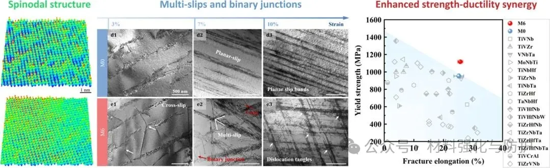 在调幅分解结构调控下,位错在相界附近发生频繁的交互、合并与缠结,最终形成位错结结构,这类位错结具有较高的能量壁垒,需要更大外加应力才能被解锁,从而直接提高了应变硬化能力。同时,M6中可动位错在变形过程中能够持续保留,并未因过度缠结而被过早耗尽,这一现象说明,调幅分解结构不仅能阻碍位错(提供强化),还能调控位错形态与相互作用模式(提供延展性维持),形成了一个可持续增强的塑性调控回路。