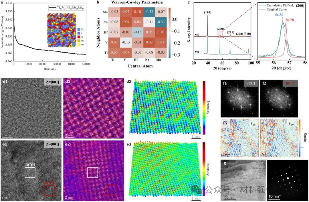 通过第一性原理+混合MC/MD模拟分析Mo与其他元素的化学相互作用发现Mo-Nb原子对具有明显负混合焓,因此易发生成分偏聚,团队以此制备合金Ti41V27Hf13Nb13Mo6(记为M6),对照组为Ti41V27Hf16Nb16(记为M0)。