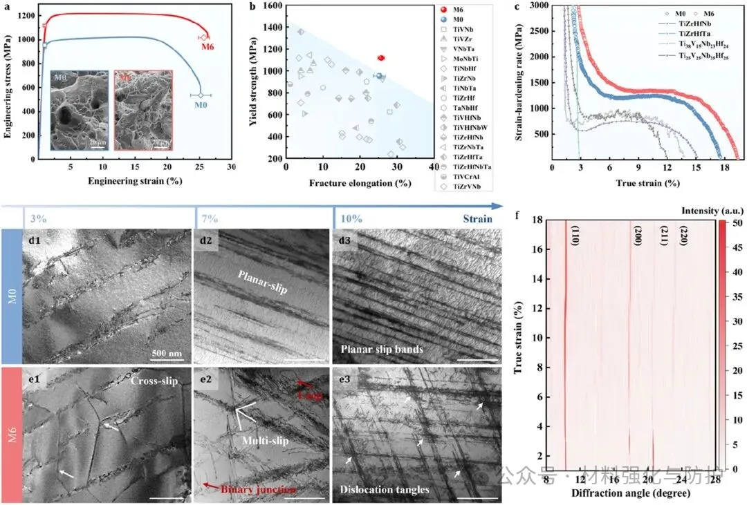 M6合金的室温拉伸性能表现出高强度与高延展性,相比M0合金,M6合金的屈服强度由~952MPa提升至~1117MPa,且断裂延伸率仍保持在~25.7% 的水平,与M0合金相当。这一性能组合在未经热处理或织构优化的铸态条件下即可实现,完全得益于内部成分波动所塑造的微观结构特征,相比传统依赖析出强化或晶界强化策略,该方法更具有热力学稳定性和可规模化生产的潜力。