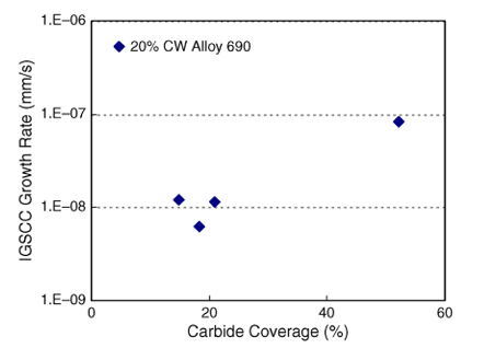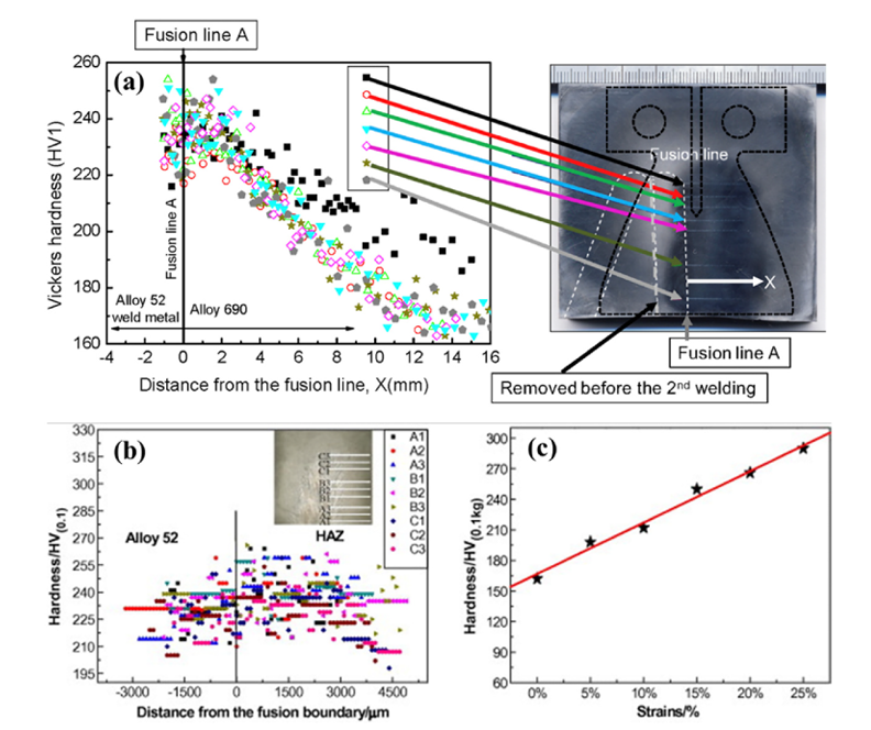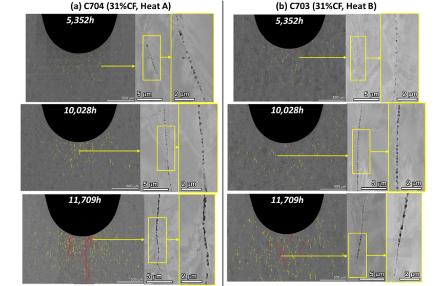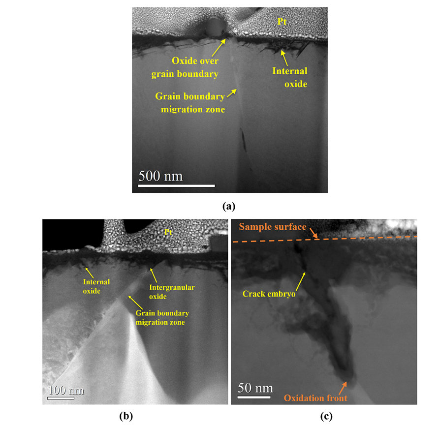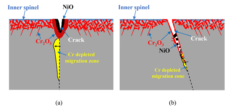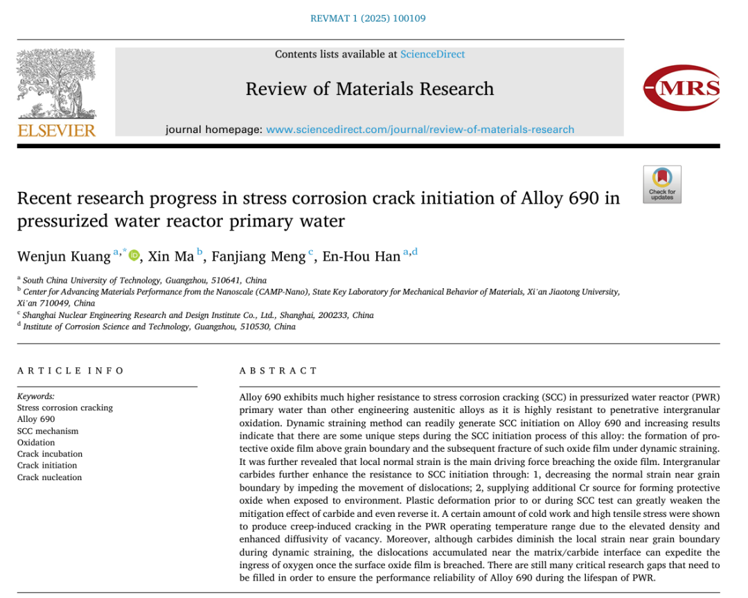 近日,华南理工大学匡文军,韩恩厚院士等在Review of Materials Research上发表综述文章,概述了在核电站压水堆一回路水冷却过程中,690合金应力腐蚀裂纹萌生的最新研究进展。 相比于其他工程奥氏体合金,在压水堆 (PWR)一回路水中,690合金表现出了更高的抗应力腐蚀开裂(SCC)性能,因其具有很高的抗渗晶间氧化性能。 动态应变方法可以很容易地在690合金上产生抗应力腐蚀开裂SCC,结果表明,在该690合金的抗应力腐蚀开裂SCC引发过程中,存在一些独特的步骤:在晶界上形成保护性氧化膜,随后在动态应变下该氧化膜破裂。进一步揭示了局部正应变是破坏氧化膜的主要驱动力。 晶间碳化物通过以下方式进一步增强对抗应力腐蚀开裂SCC的抵抗力:第一步通过阻碍位错运动,降低晶界附近的法向应变;第二步,提供额外的铬源,用于在暴露于环境中时形成保护性氧化物。抗应力腐蚀开裂SCC试验前或试验过程中的塑性变形,会大大削弱甚至逆转碳化物的缓解作用。 在压水堆运行温度范围内,由于空位密度的升高和扩散能力的增强,一定量的冷加工和高拉伸应力,会产生蠕变诱发裂纹。尽管在动态应变过程中,碳化物减小了晶界附近的局部应变,但一旦表面氧化膜被破坏,在基体/碳化物界面附近积累的位错,可以加速氧的进入。 为了确保在压水堆寿命期内,690合金的性能可靠性,仍有许多关键的研究空白有待开展。 图1: 动态应变下,在模拟压水堆一回路环境中,690合金SCC起始阶段示意图。 图2. 不同SCC初始阶段的晶界截面STEM-HAADF图像。 图3:典型SCC裂纹的横截面。 图4. 不同类型的晶界GB氧化示意图。 图5 GB氧化深度与取向差角度和GBAPD值的关系 图6: 晶间腐蚀示意图。 图7 腐蚀和应变过程解耦。 图8 晶界附近的法向应变分布。 图9 晶界附近的法向应变分布。 图10. 不同GB类型的开裂和未开裂GBs百分比。 图11 裂纹长度密度随有效碳化物覆盖率的变化。 图12:HAADF图像和晶界的EDs图。 图13: 690TT合金表面附近夹杂物处发生的SCC。 图14. 在360°C压水堆一回路水中,晶间SCC(IGSCC)生长速率。 图15:在360°C模拟压水堆一回路水中,晶间空洞和裂纹演变。 图16. 不同应变条件下,裂纹长度密度随有效碳化物覆盖率的变化。 图17 不同类型晶界的长度分数。 图18. 施加的应变振幅与GB分数之间关系。 图19 EBSD-IPF图。 图20 HV分布以及试样。 图21:氢化超临界和亚临界水中,690合金SCC引发的活化能。 图22: SCC和蠕变裂纹扩展速率的温度关系。 文献链接 https://doi.org/10.1016/j.revmat.2025.100109 本文译自Review of Materials Research
