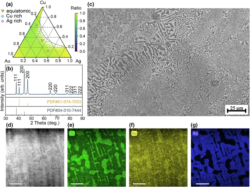 该研究采用简单的真空熔炼与退火工艺制备出等原子CuAuAg中熵合金,无需机械多次叠锻,即可在材料内部形成自发的多尺度层级结构。该结构包括:微米尺度的Cu-rich与Ag-rich条带式相分离,纳米尺度的L12有序析出相,以及原子尺度的化学短程有序(CSRO)。这种由宏观至原子的层级组织,有效实现了强化机制的层层传递,从而获得优异的力学综合性能。