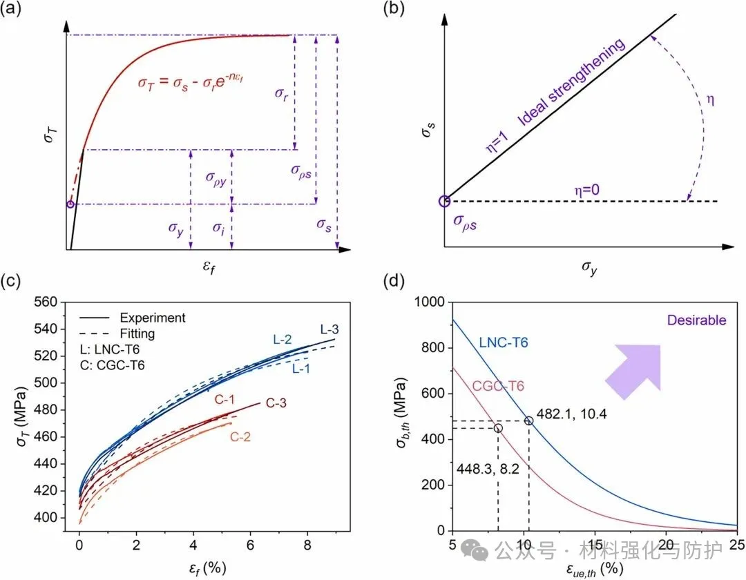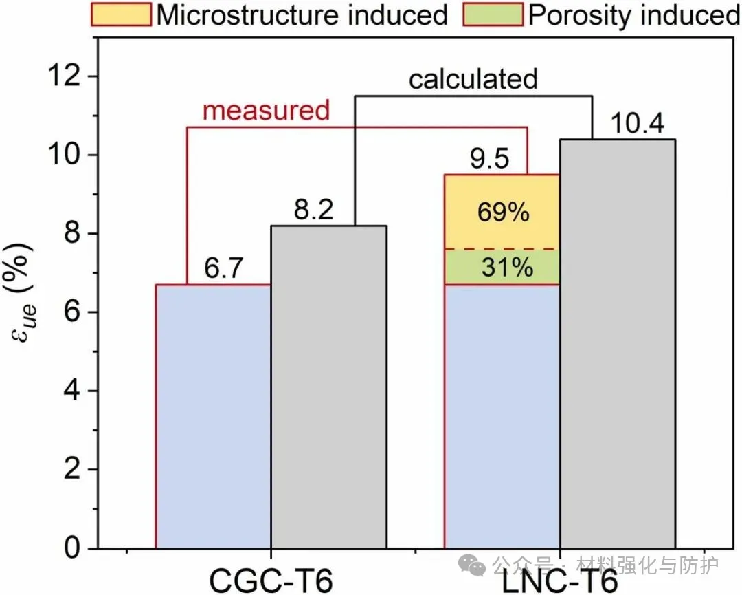 LNC-T6样品抗拉强度由448MPa提升至482.1MPa,延伸率从7.0%提高至10.9%,基于指数应变硬化模型(ESH)分析发现,延展性提升中约69%来源于异质组织带来的增强应变硬化能力,而31%来源于孔隙减少引发的变形稳定性提高,这表明本策略真正实现了组织调控与缺陷抑制的协同优势,而非性能相互牺牲的简单折中。