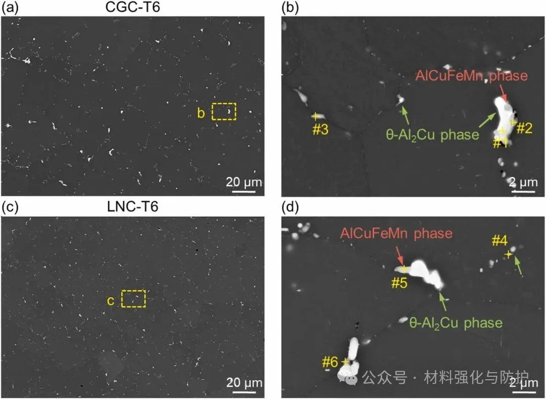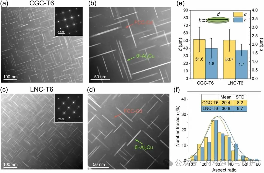 T6处理后,团队在两种状态的样品中均观察到了片状的θ'-Al2Cu析出相,且尺寸与形貌基本一致,这说明LNC处理在增强组织异质性的同时并没有实质性地改变析出机制,合金的析出强化机制并未受到折损,且LNC样品中θ'析出相的数量密度反而因Cu固溶度提高而略有提高。