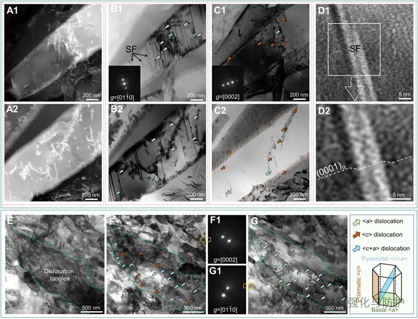 ·强度方面,旋压后合金内的几何必要位错(GND)密度提高一个数量级,高密度的GND在旋压过程中诱发合金的加工硬化效应,对最终合金的强度提高起主要的贡献作用;塑性方面,纳米晶粒和α/β界面的模量失配能够有效阻碍位错运动,同时棱柱面滑移被激活,协同之下合金依旧具有与强度适配的延展性。