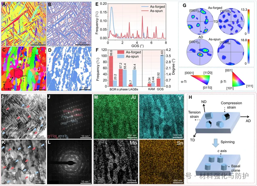 旋压过程中,初始网篮组织的α板条逐渐旋转、弯曲,形成轴向排列的纤维状形态,β基体则发生几何动态再结晶(GDRX),最终合金内形成纳米尺度的α/β层状结构,这种结构较初始的网篮组织而言能够显著提高合金内部的位错密度和晶界密度,对合金的强度与塑性均有提升作用。