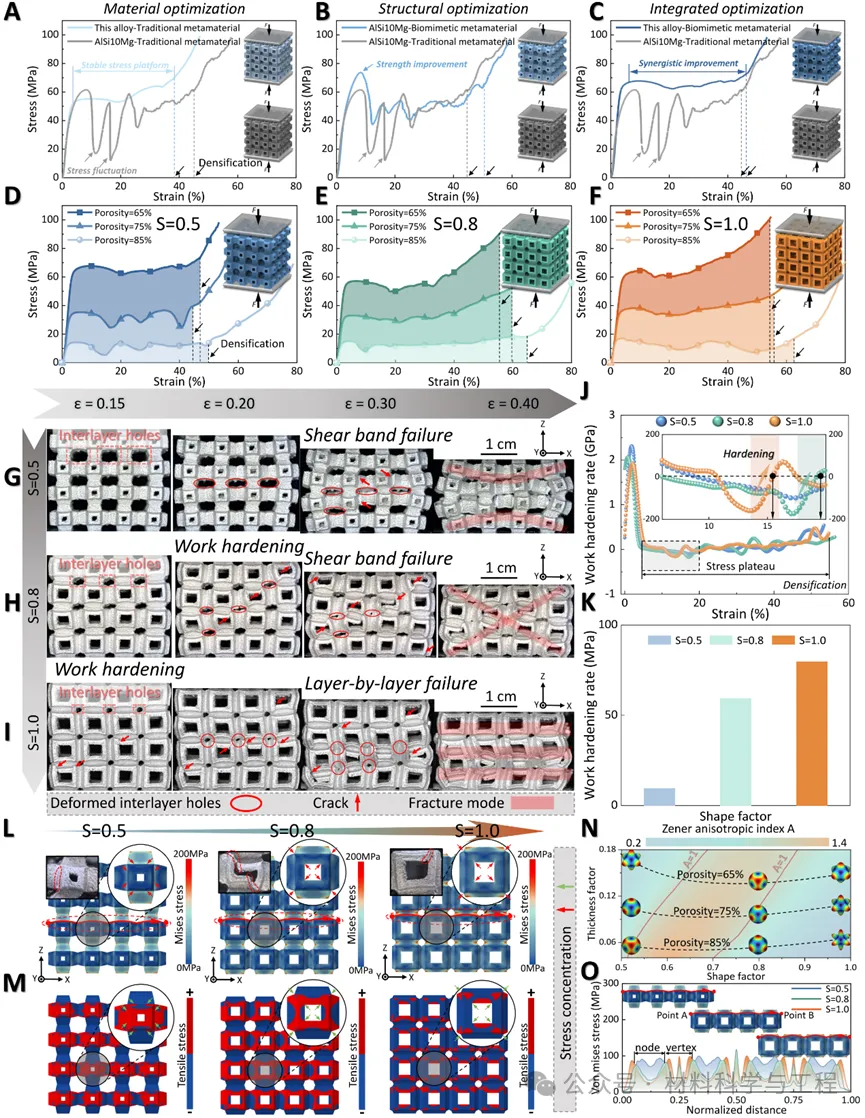 微观分析显示,该超材料在多个尺度上均展现出强化特征:纳米级Al₃Zr析出相、亚微米胞状结构与双模态晶粒组织协同作用,显著提升了材料的本征强度。在介观尺度,仿生结构引导应力由节点–支柱连接处向顶点区域有序转移,促进层间孔洞逐步闭合并诱发早期加工硬化,从而在宏观尺度实现高而平稳的能量吸收。