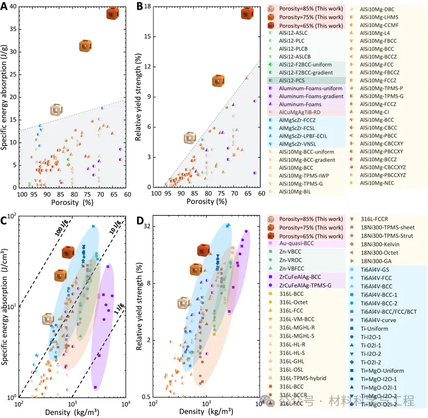 性能测试结果表明:该超材料在保持超低密度(0.91 ± 0.01 g/cm³)的同时,相对屈服强度达17.0 ± 0.7%,比能量吸收值高达39.1 ± 0.7 J/g,不仅远超已有铝基超材料,也优于多数其他金属基超材料,成功破解了“轻质”与“高强–高吸能”难以兼顾的困局。