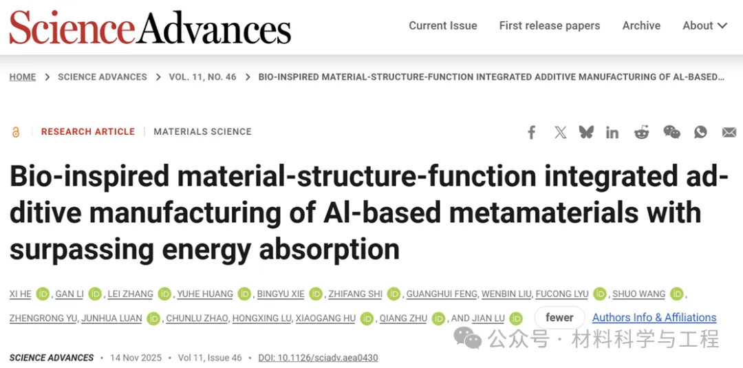 为应对上述挑战,吕坚院士领导的香港城市大学宏桥轻质金属创新研究院团队联合南方科技大学机械系朱强讲席教授团队与北京科技大学碳中和研究院等团队提出了“材料–结构–功能”协同设计理念,融合高性能轻质铝合金与仿生多级结构,推动超材料性能实现跃升。相关成果以题为“Bio-inspired material-structure-function integrated additive manufacturing of Al-based metamaterials with surpassing energy absorption"发表在顶尖期刊《Science Advances》上,通讯作者为香港城市大学吕坚院士与南方科技大学朱强讲席教授。南科大贺喜同学,香港城市大学李干博士,南昌大学张磊教授(原香港城市大学博士后)与北京科技大学黄禹赫博士为论文共同第一作者。
