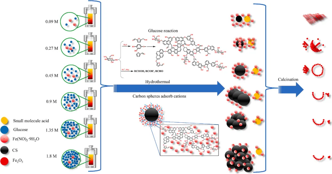 图1 XRD(a)前驱体,(b)Fe2O3(c)在32-34º范围内局部放大图。 图2 (a)C-0.09、(b)C-0.27、(c)C-0.45、(d)C-0.9、(e)C-1.35和(f)C-1.8的SEM图像。 图3 (a)Fe-0.09、(b)Fe-0.27、(c)Fe-0.45、(d)Fe-0.91、(e)Fe-1.35和(f)Fe-1.8的SEM图像。 图4 XPS谱图:(a)全谱,(b)Fe2p,(c)O1s,(d)C1s。 图5 空心Fe2O3机理示意图。 4. 小结 综上所述,通过调节反应体系中的葡萄糖浓度,可以精确控制Fe2O3结构的形成过程和最终形貌:在低浓度(<0.45M)下,形成纳米颗粒,在中等浓度下,动态平衡机制促进碳层均匀包裹核心并自组装成规则的微球结构;而在过高浓度(>0.45M)时,由于碳层的过度生长,结构变得不稳定。在反应过程中,葡萄糖氧化产生的有机酸与Fe3+或Fe2+(Fe3+还原)结合形成金属有机中间相,该中间相的热力学演化最终产生Fe2O3。Fe-0.45的最终形貌光滑圆润,平均粒径为2.88μm,平均孔径为20.3nm,比表面积为20.1m2/g。 数据来源与出处 相关研究成果以“Hydrothermal synthesis of hollow Fe2O3 microspheres: effect and mechanism of glucose concentration”为题,发表在《Materials Science & Engineering B》上。