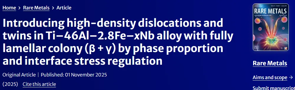 近日,国际材料期刊《Rare Metals》在线发表了题为“Introducing high-density dislocations and twins in Ti–46Al–2.8Fe–xNb alloy with fully lamellar colony (β+γ) by phase proportion and interface stress regulation”的研究论文。本论文中,团队通过调控β/γ相比例、利用界面应力及Nb固溶效应,在新型(β+γ)全层片TiAl合金中成功引入高密度位错、层错与三维纳米孪晶网络(nanotwin network),使合金在室温压缩下实现2966 MPa强度与39.6%塑性的优异组合,并在750 ℃展现良好的高温拉伸性能(492 MPa,4%)。通讯作者为哈尔滨工业大学方虹泽教授和陈瑞润教授。