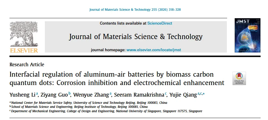 Yusheng Li, Ziyang Guo, Wenyue Zhang, Seeram Ramakrishna, Yujie Qiang, Interfacial regulation of aluminum-air batteries by biomass carbon quantum dots: Corrosion inhibition and electrochemical , J. Mater. Sci. Technol. 255 (2026) 318-328