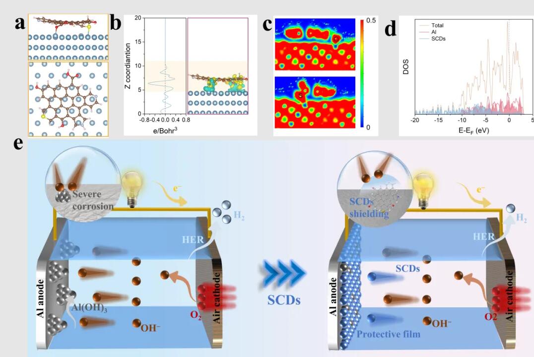 01 全文速览 本研究由北京科技大学、北京理工大学、新加坡国立大学联合完成。科研团队创新性地将槐叶衍生碳量子点(SCDs)引入碱性铝空气电池电解液中,实现了电极界面调控与腐蚀抑制的协同优化。SCDs在铝表面形成稳定的平行吸附膜,有效抑制自腐蚀与析氢副反应,使电池比容量提升至 1538.5 mAh g⁻¹、能量密度达 1800 Wh kg⁻¹。该研究为绿色生物质功能材料在金属空气电池中的高效应用提供了新思路。 02 研究背景 铝空气电池(Al–air battery, AAB)因其高比能量、铝资源丰富、环境友好等优势,被认为是最具潜力的下一代储能体系之一。然而,电池在碱性电解液中运行时,阳极铝会发生自腐蚀和析氢副反应,导致放电效率下降、能量浪费严重,成为限制其商业化应用的关键瓶颈。 针对这一问题,科研界已提出多种缓解策略,包括阳极合金化改性、防护涂层构建、油驱体系设计以及电解液优化等方法。前几种方案虽能在一定程度上提升电极稳定性,但往往面临制备工艺复杂、成本高、体系兼容性差等局限。相较之下,电解液添加剂法因其操作简便、成本低、易调控等优势,成为当前研究的热点方向。 然而,现有电解液添加剂仍存在多重不足: 一是高效性依赖于高浓度添加,容易导致电导率下降、极化加剧等副作用; 二是多数有机分子或无机盐添加剂存在环境友好性差、可再生性低的问题,与绿色储能理念相悖; 三是在强碱体系中,传统有机添加剂易发生分解或吸附不稳,导致缓蚀效果随时间衰减; 四是缺乏对分子层面界面调控机制的深入理解,使得添加剂设计仍以经验为主。 因此,亟需开发一种兼具高效缓蚀、结构可调、环境友好的新型添加剂,实现对铝空气电池阳极/电解液界面的精确调控,为实现高能量密度与长寿命并存的绿色电池体系奠定基础。 03 本文亮点 (1)绿色原料、低成本制备:以自然可再生的槐叶为碳源,不仅降低了制备成本,还赋予材料优异的环境友好性和可持续性,契合“双碳”战略背景。 (2)多官能团协同吸附机制:SCDs富含C、O、N、S等异质原子官能团,能在铝表面形成稳定的平行吸附膜;通过Al–O、Al–S配位作用实现界面致密化,有效阻断阳极溶解与析氢副反应。 (3)性能显著提升:在仅0.2 g·L⁻¹的低浓度下,SCDs即可实现41.5%的缓蚀效率与1.5–1.9倍的阳极寿命延长;同时比容量提升至1538.5 mAh·g⁻¹、能量密度达到1800 Wh·kg⁻¹,远超未添加体系。 (4)实验—理论协同揭示机理:结合电化学测试、表面谱学分析与密度泛函理论(DFT)计算,系统揭示了SCDs在Al(111)晶面上平行吸附—电子重分布—界面钝化的多尺度作用机制,为未来电解液添加剂的分子设计提供了新范式。 04 图文解析 图1. SCDs的制备与表征。(a) SCDs的制备流程示意图;(b) 原子力显微镜(AFM)图像;(c) 透射电子显微镜(TEM)图像;(d) TEM图像的粒径分布分析;(e) 傅里叶变换红外光谱(FTIR);(f)–(i) X 射线光电子能谱(XPS)图谱。 图2. SCDs对电解液性能的调控作用。(a) 开路电位(OCP)曲线;(b) Nyquist 阻抗图;(c)–(d) Bode 图;(e) 动电位极化曲线;(f) 电化学阻抗谱的等效电路拟合模型;(g) 析氢测试装置示意图。(h) 析氢实验结果;(i) 电化学稳定性测试结果。 图3. SCDs 对铝空气电池(AABs)放电性能的影响。(a) 铝空气电池的结构示意图;(b) 实验装置实物照片;(c) 红外热成像图;(d) 极化曲线及对应的功率密度图;(e) 阶梯放电曲线;(f) 间歇放电曲线;(g) 极限放电曲线;(h) 比容量变化曲线;(i) 性能对比图;(j) 铝空气电池驱动电子设备的实物照片。 图4. SCDs 对铝空气电池优化机理示意图。(a) 优化后的吸附结构:上图为侧视图,下图为俯视图;(b) SCDs/Al(111) 体系的Z方向与三维差分电荷密度分布图;(c) 电子局域函数(ELF)分布;(d) SCD/Al(111) 的态密度(DOS)图;(e) 作用机理示意图。 05 总结与展望 本研究创新性地提出了利用生物质碳量子点(SCDs)调控铝空气电池电极界面的新策略,首次实现了界面调控与缓蚀性能的协同优化。实验与理论结果表明,SCDs 分子可在铝表面形成稳定的平行吸附膜,通过Al–O / Al–S 配位与电子重分布,有效抑制阳极溶解和析氢反应,显著提升电池稳定性。在仅 0.2 g·L⁻¹ 的低浓度下,SCDs 即实现1.9 倍阳极寿命提升,并使能量密度达 1800 Wh·kg⁻¹。研究为绿色碳量子点材料在储能体系中的应用提供了新思路,也揭示了“绿色分子设计—界面吸附—性能响应”的内在关联。未来,该方法可拓展至锌空气电池、水系金属电池及燃料电池等体系,为构建高性能、长寿命的绿色储能器件提供可持续的发展路径。 06 作者介绍 强玉杰,北京科技大学国家材料服役安全科学中心(主任:庞晓露)副教授,新加坡国立大学访问学者。主要从事绿色缓蚀新材料、金属空气电池、水系金属电池等研究。32岁起入选“科睿唯安”全球高被引科学家,28岁起入选斯坦福大学全球前2%顶尖科学家,获中国科协青年人才托举工程、先进材料青年科学家出版工程及之江实验室国际青年人才。主持国家自然科学基金面上/青年基金、国家外专项目,20余项省部级和央企产学研攻关项目。累计发表SCI论文100余篇,第一/通讯作者SCI论文80余篇(18篇腐蚀顶刊Corrosion Science,6篇JMST,累计24篇ESI高被引论文),总被引超1.2万次,H因子53。公开15项中国、荷兰、美国等国家发明专利。荣获 “北京榜样”、“北京青年榜样”、《科学中国人》“年度科技新锐”。相继获中国腐蚀与防护学