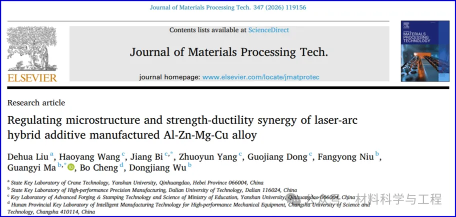 基于此,燕山大学、大连理工大学等单位将激光-电弧复合增材(LAHAM)与热处理相结合,在不改变合金成分的前提下,通过调控激光功率和热处理工艺实现了缺陷、晶粒、析出相的多维度调控,为解决Al-Zn-Mg-Cu合金增材制造的性能瓶颈提供了有效方案,研究成果以“Regulating microstructure and strength-ductility synergy of laser-arc hybrid additive manufactured Al-Zn-Mg-Cu alloy”为题,发表在期刊《Journal of Materials Processing Technology》上。