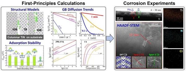 氮化钛涂层具有优异的力学强度、化学稳定性和耐磨损性,在多个领域具有应用价值。但是,氯离子易沿各类晶界入侵,导致氮化钛涂层腐蚀加速甚至涂层结构失效。同时,氯离子在不同晶界上的稳定性和扩散规律尚不清晰,制约了涂层精准设计和可控制备技术发展。
