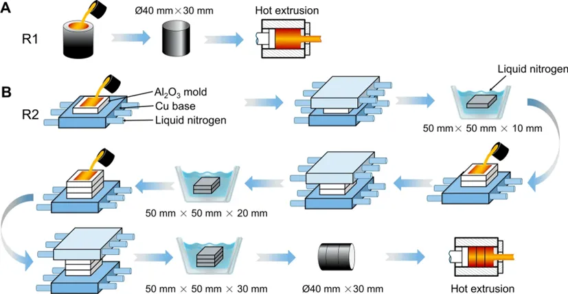 研究团队提出的 ACIF 技术,从增材制造的层层堆叠思路中获得启发,通过“分层快速凝固”与“界面熔合”两个关键步骤,使厚达30 mm的Zn-Fe合金铸锭仍能保持近似薄壁样品的高冷却速率。具体而言,研究团队首先将合金液体分层浇注,每一层的厚度仅为5-20 mm,使其在Cu模具与液氮环境中迅速冷却并固化;随后,再将固化后的多层结构叠加,以构建更厚的铸件;最后在挤压过程中,通过高温塑性变形让各层界面完全熔合,从而获得结构连续的整体材料。通过这种累积式快速冷却路径,每一层在小截面下获得的高冷却强度得以“叠加”到最终体积材料中,使整体铸锭的平均冷却速率达到817 ℃/min,远高于传统空气冷却方式。