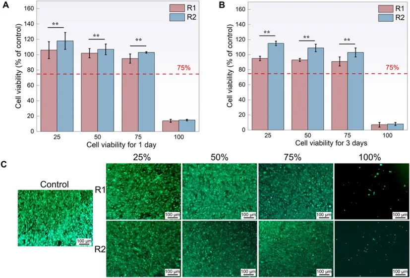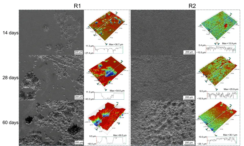 在0.9% NaCl溶液中进行长时间的浸泡实验,在长达60天的腐蚀过程中,R1样品出现了超过69 μm的深度点蚀,而R2样品的最大腐蚀深度仅为36 μm左右,同时基于腐蚀深度分布计算的腐蚀均匀性系数γ从0.71降至0.24,表明ACIF样品的腐蚀分布更加均匀,避免了由粗大第二相诱发的微电偶效应腐蚀机制,也因此具有更优的细胞相容性。