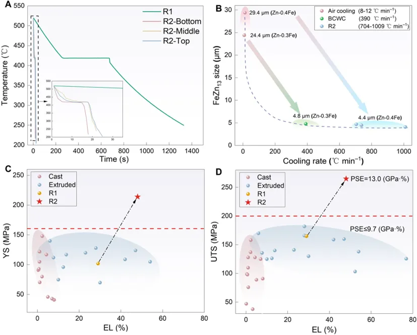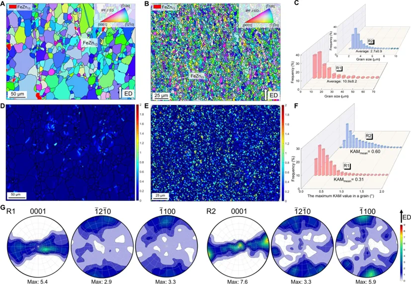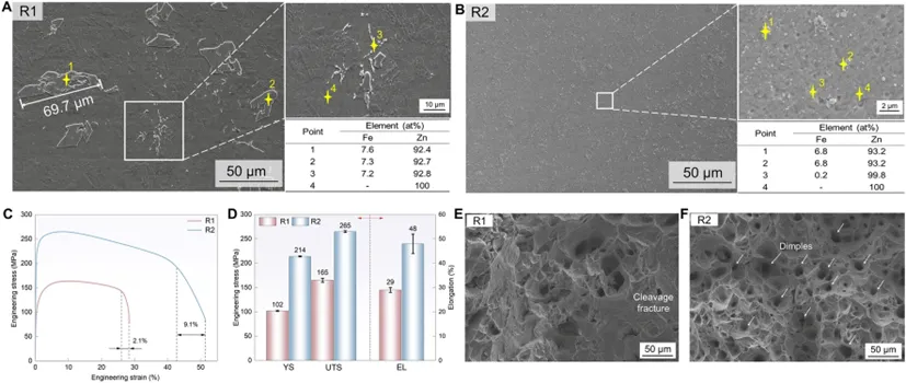 ACIF技术通过分层快速凝固,使铸态Zn-0.4Fe合金中FeZn13第二相由R1的粗大片状结构彻底转变为R2均匀的颗粒状形貌,R1样品中第二相平均尺寸高达29.4 μm,并伴有超过数百微米的粗大片状结构,而R2样品的第二相相尺寸被限制在约4-5 μm范围内,在挤压过程中,这些细化的颗粒被进一步破碎为0.4 μm的超细弥散颗粒,大幅减少了脆性第二相的尺寸与形貌差异,从根本上抑制应力集中。