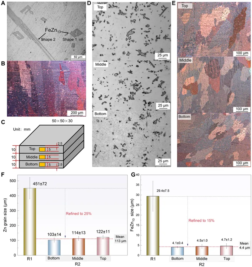Zn基可降解金属由于其适中的体内腐蚀速率与良好的生物相容性,在骨修复与心血管支架领域中逐渐成为被重点关注的新型材料体系。尤其是Zn-Fe合金,由于微量Fe的加入会显著提升Zn的力学性能,因此被视为结构增强型Zn基材料中最具应用潜力的候选之一。然而,Zn-Fe合金的实际性能提升一直受到固有金相特征的限制。Fe在Zn中的固溶度极低,导致在铸态中极易形成FeZn13脆性相,且随着铸锭截面变大,FeZn13会迅速长大并向片状、针状形貌演变。这些粗大而尖锐的脆性相会在变形过程中引发严重应力集中,使Zn-Fe合金的塑性大幅下降。同时,这些粗大第二相作为电偶腐蚀微电池的阴极,会进一步诱发局部点蚀,使腐蚀行为极不均匀。此外,现有快速凝固技术只能应用于薄截面样品,难以制备适用于医疗器械的粗截面长棒材料,因此限制了Zn-Fe合金实际工程化的可能性。
