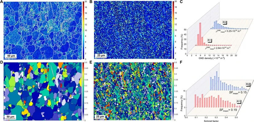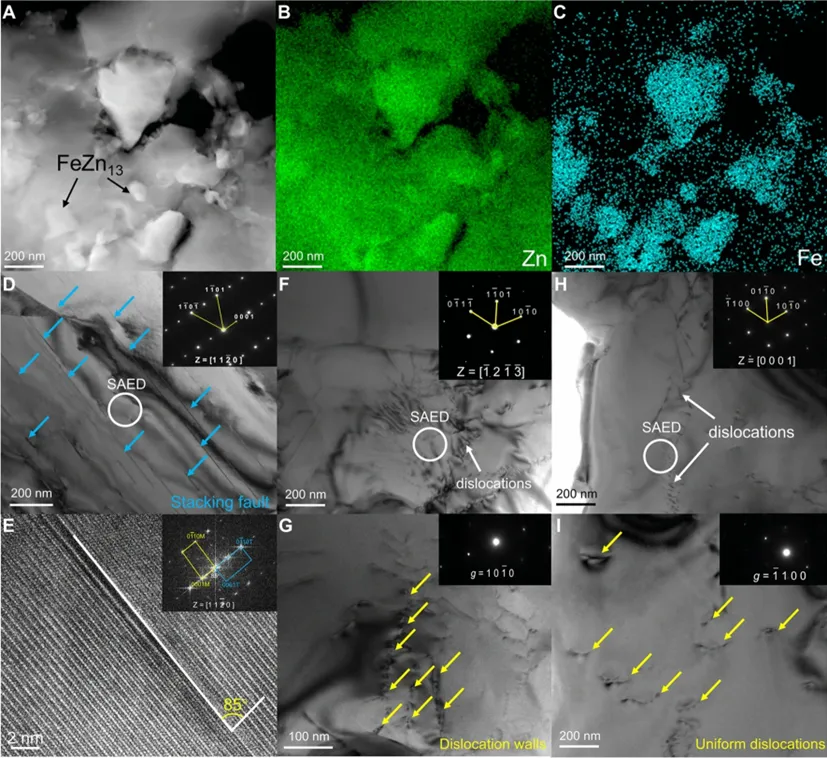 在变形过程中形成了更高密度的位错结构、更丰富的堆垛层错以及更明显的位错墙,这些结构共同提升了材料的加工硬化能力;多重强化机制共同作用,使R2样品不仅能够在屈服前储存更多位错,还能够在后续加工硬化阶段维持高应变硬化速率,从根本上实现Zn-Fe合金中较难达成的高强度与高塑性的协同组合。