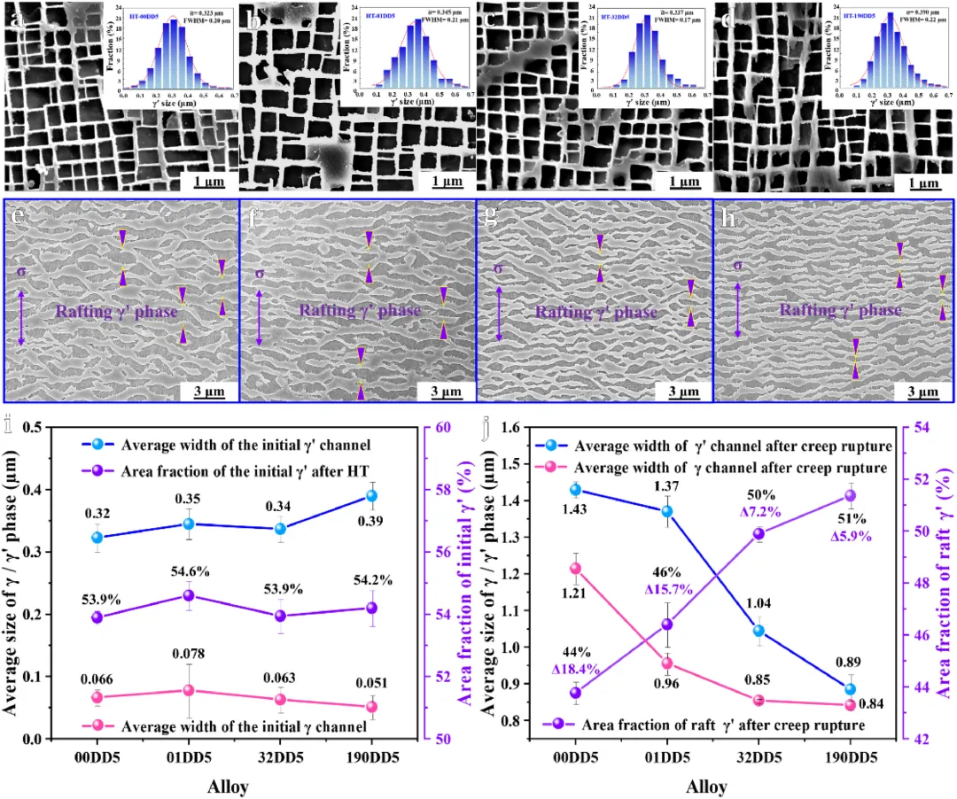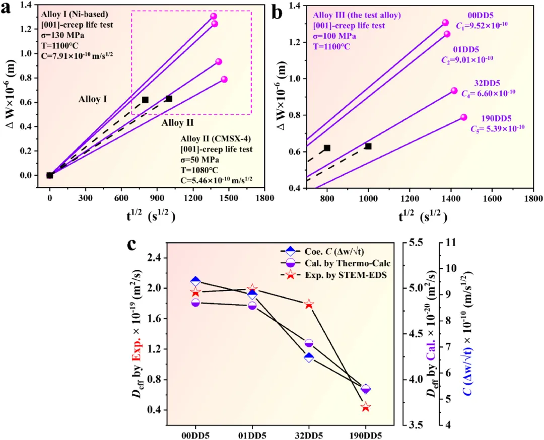 作者制备了四种Y掺杂合金(00DD5、01DD5、32DD5、190DD5,对应Y浓度0、10、320、1900 ppm),通过定向凝固确保[001]取向单晶。蠕变测试采用圆柱试样在1100 ℃/100 MPa下进行,结合SEM、STEM、HR-XRD等多尺度表征分析微观结构演化。此外,利用Darken扩散模型、Eshelby应力计算和修正的Norton方程,量化了扩散系数、晶格失配及蠕变寿命预测。