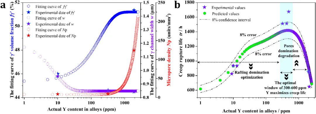 团队建立了DD5蠕变寿命的预测模型,该模型整合了合金的筏化参数,包括:γ通道宽度w、γ'体积分数fγ'和微孔密度Np等参数,模型的预测误差<8%,模型显示Y浓度的适宜添加区间为300-600 ppm,该区间内的Y浓度能够平衡合金的强化与损伤,动力学分析表明Y使γ通道扩宽系数降低43.4%,而Gibbs自由能计算验证了能量释放与筏化速率的相关性。