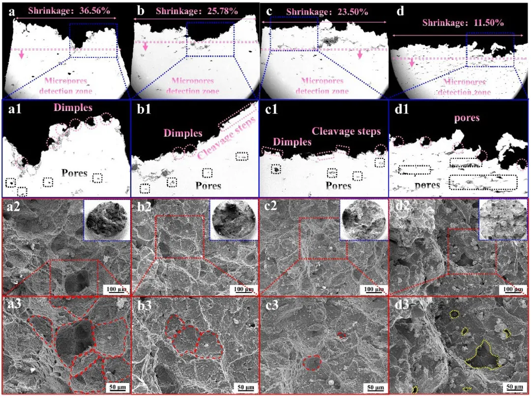该研究以DD5合金为研究对象(一种高性能的高温合金,其核心成分主要包括镍、铬、钴等元素),通过在DD5合金中添加不同浓度Y(0-1900 ppm),并在1100 ℃/100 MPa条件下进行蠕变测试,发现Y的临界阈值约为320 ppm,低于此值时,Y抑制原子扩散并降低γ/γ'晶格失配应力,延缓粗化过程,从而提升蠕变寿命;但超过320 ppm后,过量Y促进微孔在枝晶间形核,引发脆性断裂,导致寿命下降,团队提出了一个综合模型,量化了筏化组织与微孔损伤的竞争机制,为合金设计提供了优化窗口(300-600 ppm Y)。