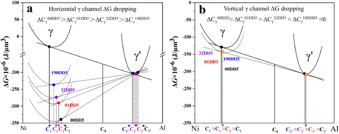 添加Y后,DD5合金的筏状微观结构显著细化,蠕变实验后,γ基体的通道宽度减少30%,同时γ'体积分数增至51%,且Y主要是以固溶于γ基体的形式存在(固溶度为0.05-0.20 at.%),Y固溶之后能够降低基体的有效扩散系数,晶格失配分析显示,水平通道失配应力从-0.37%降至-0.11%,证实Y能够通过热力学和动力学抑制粗化。