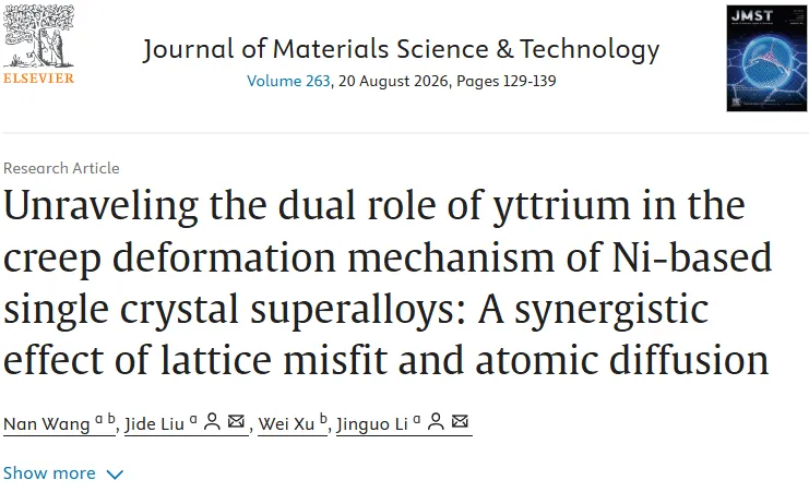 中国科学院金属研究所与东北大学轧制技术及连轧自动化国家重点实验室(现已重组为东北大学数字钢铁全国重点实验室)的联合团队于2025年11月在材料领域权威期刊《Journal of Materials Science & Technology》期刊上在线发表题为“Unraveling the dual role of yttrium in the creep deformation mechanism of Ni-based single crystal superalloys: A synergistic effect of lattice misfit and atomic diffusion”的研究论文。在该论文的工作中,团队系统研究了钇(Y)掺杂对DD5镍基单晶高温合金蠕变性能的影响,发现Y浓度在320 ppm时合金的蠕变寿命提升165%,但超过此阈值反而会导致寿命下降44%,同时团队系统揭示了Y通过调控原子扩散和晶格失配应力来影响蠕变机制的协同效应。通讯作者为中科院金属所刘纪德副研究员和李金国研究员。