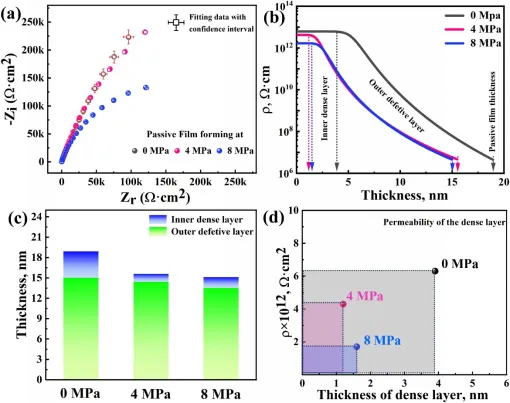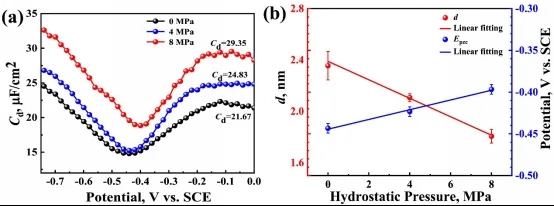 系统的研究表明,静水压力在钛合金氢损伤过程中扮演着“加速器”与“破坏者”的双重角色:首先,静水压将电极表面的亥姆霍兹层(Helmholtz layer)厚度压缩约23%,导致界面电场强度增加,使表面吸附氢的覆盖度从0.15激增至0.99,Volmer析氢反应速率指数级增加,极大地增加了氢进入基体的驱动力;其次,静水压破坏了钛合金劣化了表面钝化膜,使其致密内层厚度削减超过50%(从3.9 nm减薄至1.6 nm),且膜内缺陷密度倍增,导致其阻挡氢渗透的能力大幅下降。研究进一步建立了静水压—氢渗透动力学模型,建立了钛合金深海环境下氢损伤阈值电位的安全服役判据。