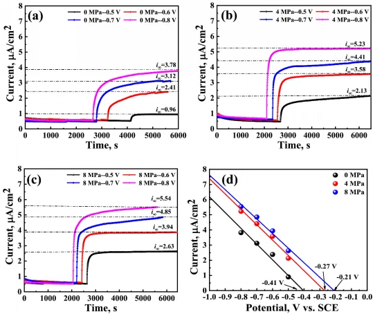 针对这一重大需求,中国科学院金属研究所宋影伟研究员团队采用深海高压氢渗透原位测试技术,创新性地发现了“静水压力诱导氢损伤阈值电位正移”现象。研究团队通过构建“界面电场强度—析氢反应动力学—钝化膜理化特性”协同作用模型,成功破译了深海高压环境下钛合金氢损伤敏感性显著增加的物理机制。该研究的创新成果主要体现在:(1)首次量化了静水压力导致的氢致损伤阈值电位漂移规律(从常压的-0.41 V(SCE)正移至8 MPa下的-0.21 V(SCE));(2)揭示了静水压力通过物理压缩双电层厚度、增强界面电场,进而指数级加速析氢反应动力学的微观机理;(3)阐明了静水压导致钝化膜致密层显著减薄与电子结构改变的劣化机制,证明了“膜层屏障失效”与“表面反应加速”存在正反馈协同效应。