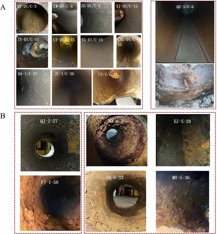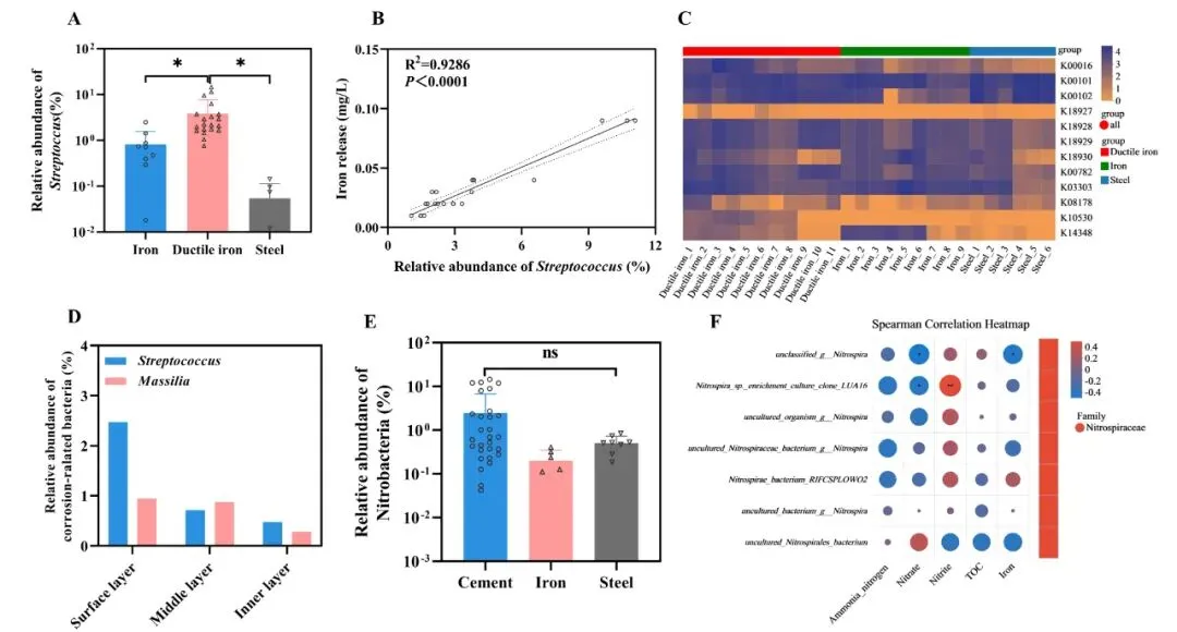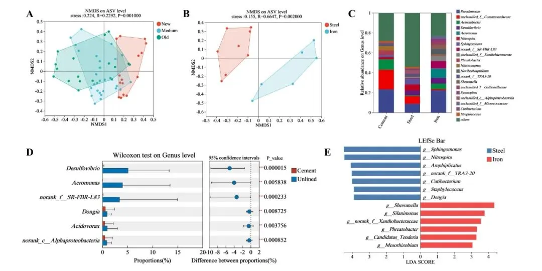 金属管道在供水管网中历史悠久且应用广泛,其长期存在的腐蚀问题仍是导致水质劣化与基础设施老化的核心挑战。腐蚀过程不仅引发铁、锰等重金属释放,更在管道内壁形成复杂的生物膜,二者协同作用,严重威胁饮用水安全。目前,尽管研究已识别出多种与腐蚀相关的功能性微生物,但关于管道材质、保护性内衬如何与附着生物膜相互作用,从而驱动差异化腐蚀机制这一关键科学问题,仍缺乏系统性的现场实证与机理阐释。为此,本研究通过对上海市在役的21根不同材质、不同服役年限的现场管道进行系统性调查,整合流式细胞术、16S rRNA 高通量测序及宏基因组学等多维度分析技术,旨在揭示材料特异性生物膜群落的构建规律及其功能分化,并阐明关键微生物类群通过硫酸盐还原、产酸等代谢途径加剧管道腐蚀的微观机制。 由脱硫弧菌属Desulfovibrio spp. 产生的硫酸盐还原是加速无涂衬金属管道腐蚀的主要机制。 产酸链球菌属Acidogenic Streptococcus spp.可作为水泥涂衬球墨铸铁管铁释放的特征微生物。 在不同材质供水管壁生物膜中的腐蚀相关微生物是由不同水化学指标分别调控的。 研究进展 本研究构建的“材料-化学-生物膜”三元互作框架,为理解老化供水管网中微生物腐蚀的驱动机制提供了新视角,并为建立非侵入性的腐蚀风险预测与精准防控策略提供了理论基础。 图1 图文摘要 如图2,通过对19处现场管段内腐蚀形貌的宏观解析,系统揭示了不同材质供水管道随服役年限增加的腐蚀演变规律。结果表明,球墨铸铁管在水泥内衬保护下,其抗腐蚀性能显著优于无内衬管道。具体而言,服役≤20年的球墨铸铁管内衬保持完整,未见明显腐蚀产物渗透;而当服役年限达到25年时,开始出现内衬局部破损与基材暴露现象。在无保护层的管道中,腐蚀进程明显加速,其中无内衬钢管表现出最为严重的劣化特征,管壁表面形成大量瘤状腐蚀结瘤。该系列结果直观证实,水泥砂浆内衬能够通过维持材料形态完整性与延缓结构降解,有效提升球墨铸铁管在供水管网中的长期耐腐蚀性能。 Fig. 2. Corrosion progression and associated structural modifications in metallic water distribution pipelines. Pipe characteristics are coded as: I(cast iron), DI (ductile iron), S (steel), and C (cement mortar lining), with nomenclature reflecting pipe material/coating-age relationships. (A) Temporal corrosion patterns in cement-lined water mains: Left panel - Ferrous alloy pipes (cast iron/ductile iron), Right panel - Steel pipe variants. (B) Unprotected corrosion evolution in urban water infrastructure: Left panel - Cast iron conduit degradation, Right panel - Carbon steel pipe deterioration. Fig. 3. Flow cytometry-based viability profiling of bacterial communities in pipe biofilms and adjacent hydraulic compartments. (A) Comparative viability between cement-mortar-lined and uncoated metal pipe surfaces. (B) Biofilm viability stratification by pipe service duration: New (0–10 years), Medium (10–30 years), and Old (>30 years) groups. (C) Longitudinal distribution of biofilm viability across upper, middle, and lower pipe cross-sections. (D) Hydraulic transport dynamics reflected in viable cell counts from upstream and downstream water columns across pipe materials. 通过流式细胞术对管壁生物膜活菌密度的定量分析揭示,无内衬保护的金属管道表面生物膜生物量显著高于水泥内衬管道,其活菌密度可达后者的13.5倍以上。研究进一步发现,生物膜的积累随管道服役年限呈现材料依赖性:水泥内衬系统随老化出现生物膜的持续增长,这与其内衬逐步破损、基底金属暴露相关;而无内衬钢管的生物膜生物量则在达到高位后趋于稳定。此外,研究未在金属干管中发现显著的生物膜径向分布差异,但在腐蚀严重的无内衬或内衬破损管道中,观察到显著的生物膜脱落现象。这些结果表明,腐蚀初期为生物膜定殖创造了有利条件,而后期形成的腐蚀产物在维持高生物量的同时,也增加了生物膜脱落与微生物释放的风险。 本研究通过微生物群落分析,揭示了供水管网生物膜群落结构具有显著的材料依赖性与时间动态性。研究发现,钢管中的生物膜群落丰富度显著高于铸铁管,而水泥内衬则能有效削弱材料本身对群落结构的影响。统计分析进一步确认,管道材质与服役年限是塑造生物膜群落结构的两个关键因素。 Fig. 4. 16S rRNA profiling reveals material composition and service duration impacts on pipeline biofilm consortia structure. (A-B) Non-metric Multidimensional Scaling (NMDS) ordination employing Bray-Curtis dissimilarity metrics evaluates β-diversity variations in pipeline biofilm communities under different: (A) infrastructure aging gradients; (B) substrate material compositions. (C) Taxonomic composition histograms illustrating material-dependent phylogenetic distribution patterns in adherent biofilms. (D) Differentially abundant microbial taxa (genus-level) between cement-lined and unalloyed ferrous pipelines identified through Student's t-test with Benjamini-Hochberg correction (P <0.05). (E) LEfSe biomarker discovery analysis delineating phylogenetically distinct genus in carbon steel versus cast iron surface biofilms using linear discriminant analysis (LDA) effect size threshold >2.0 (P <0.05, FDR-corrected). 在菌群演替方面,研究观察到随服役时间增长,Pseudomonas 和 Acinetobacter 等具有强成膜能力的菌属比例显著上升。更重要的是,不同材质管道表面选择性富集了功能迥异的菌群:水泥内衬表面主要富集Comamonadaceae,而无内衬的金属表面则特异性富集以 Desulfovibrio 