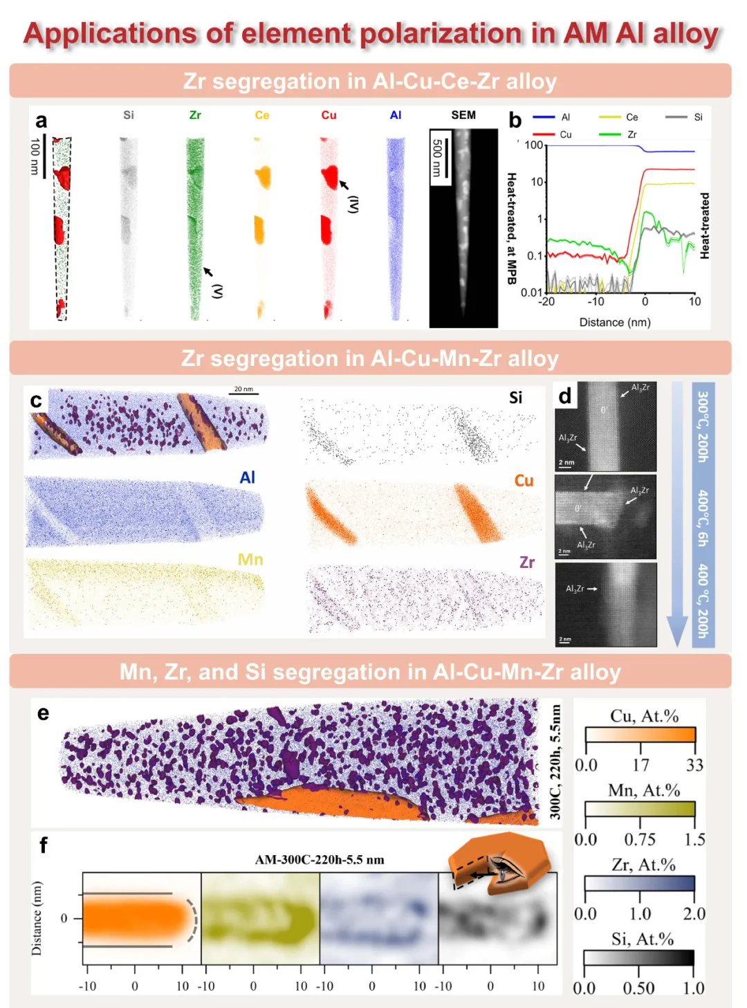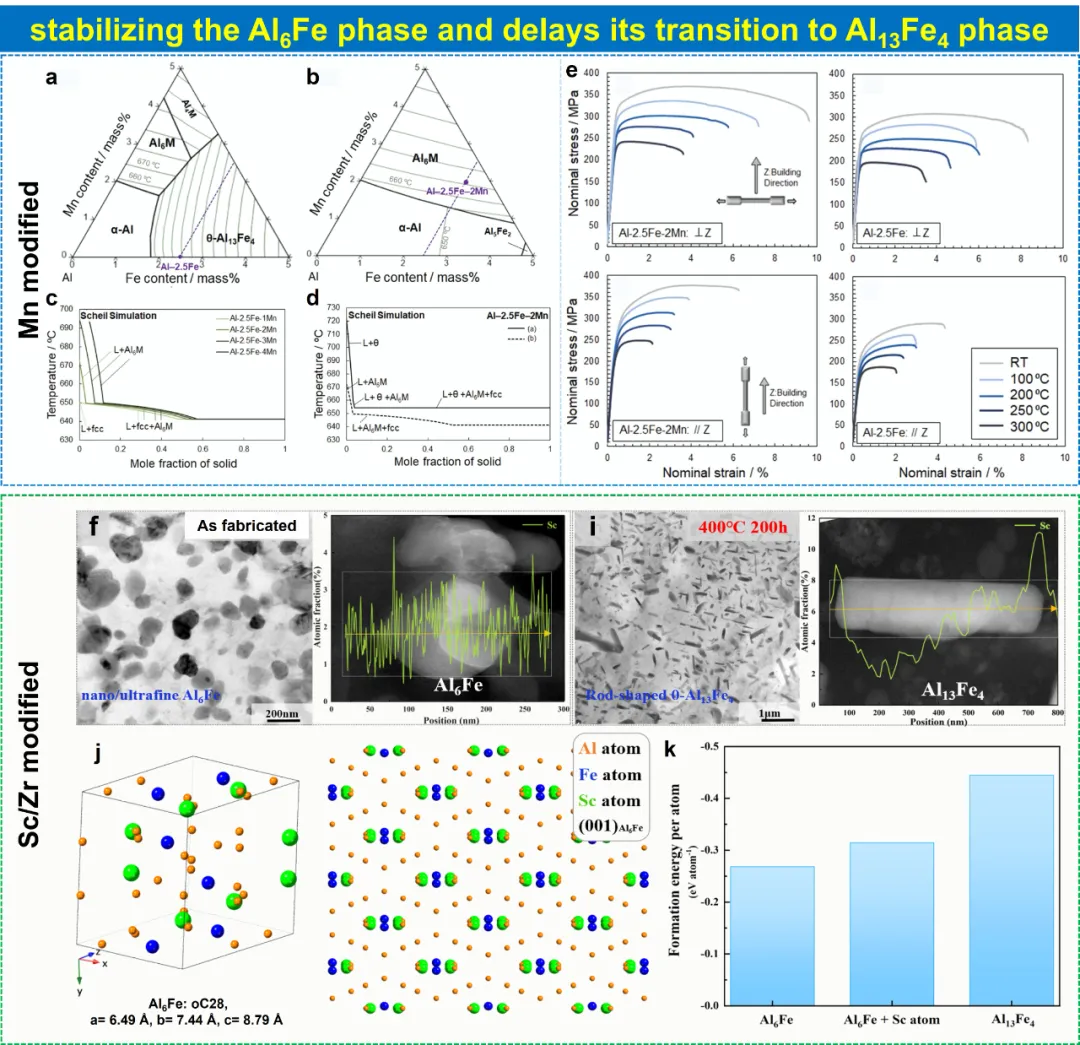 图11、铝铁合金抑制θ相形成的策略。研究人员尝试通过添加锰、钪、锆等元素来稳定Al6Fe合金