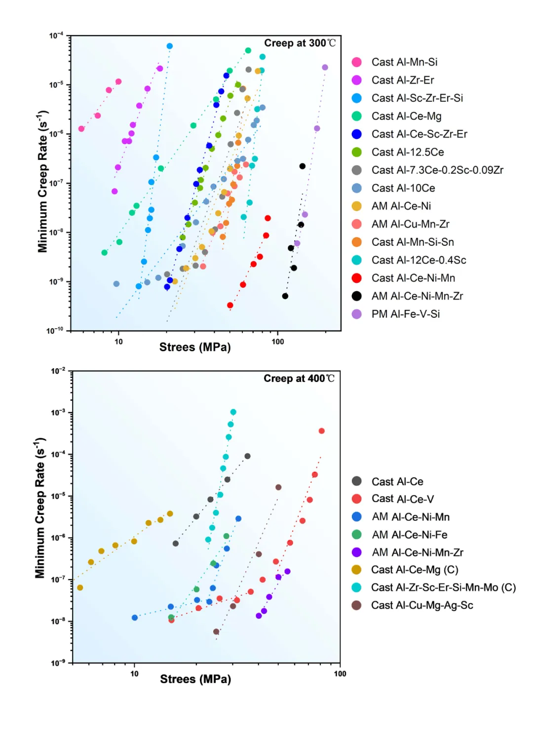 高温强化机制深度解析 本文总结了目前报道的耐热铝合金在常温及高温下的力学性能,为后续耐热铝合金的开发提供了全面的性能数据库。 图19、目前报道的耐热铝合金在常温及高温下的力学性能 图20、AM耐热铝合金在拉伸或压缩(C)时的最小蠕变应变速率与应力的双对数图(a) 300°C和(b) 400°C