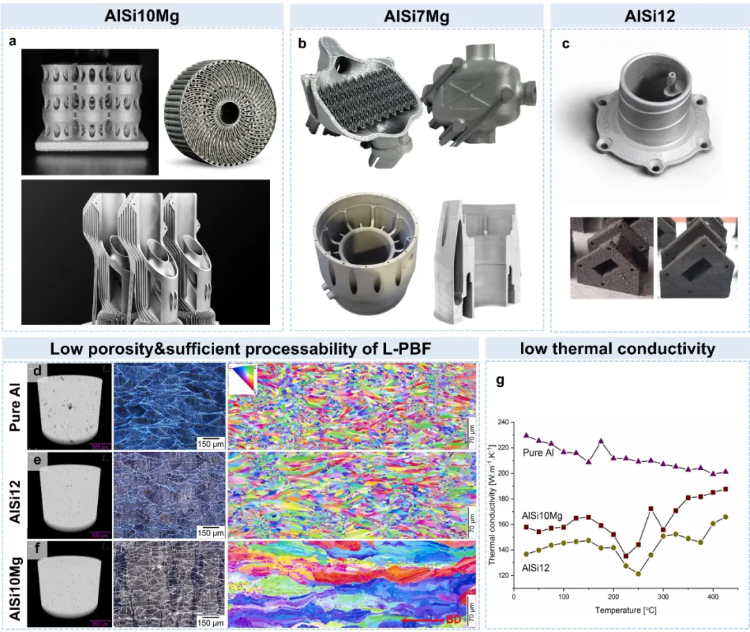 图3、(a) 3D打印AlSi10Mg组件:采用EOSM27052材料与轻量化部件构建的类双晶结构。(b) 3D打印AlSi7Mg组件:热交换器与涡轮发电机总成。(c) 3D打印AlSi12组件。(d)纯铝、(e) AlSi12和(f)AlSi10Mg的52张X射线透射电镜图像显示孔隙分布,(g)摄影机显微图像及平行于构建方向的EBSD IPF-Z截面图。(g)不同温度下纯铝、AlSi12和AlSi10Mg的热导率对比。