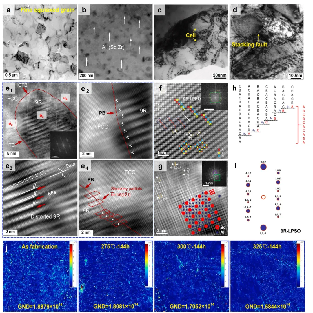 图7、PBF-LB铝镁钪锆合金的显微组织与高温性能 图8、铝镁钪锆合金中的位错、层错及9R强化机制