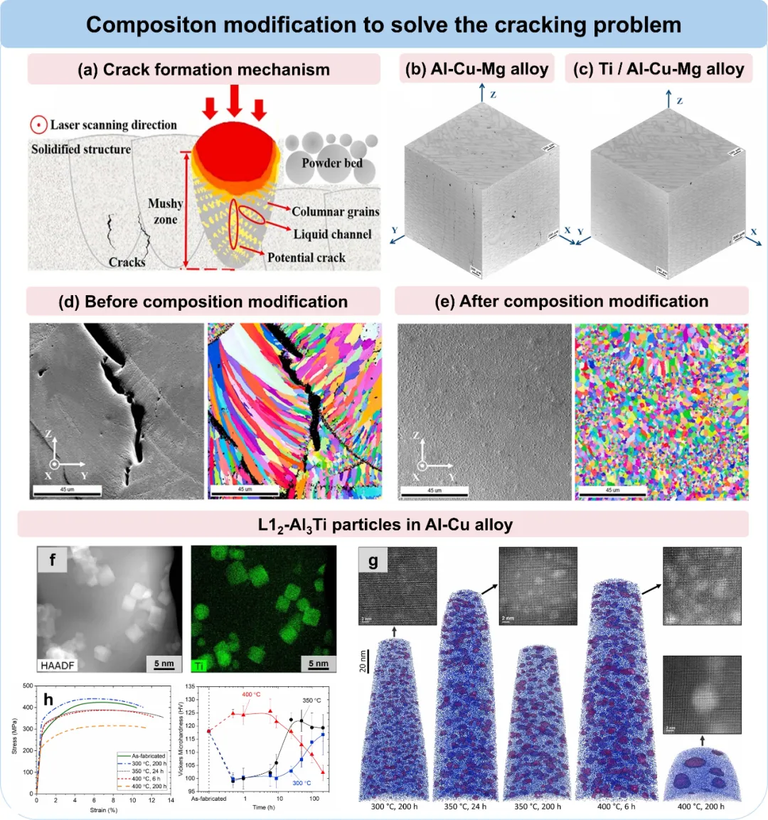 Al-Cu系:添加Sc、Zr形成L1₂-Al₃(Sc,Zr)相,既能细化晶粒(从柱状晶变为等轴晶),又能抑制裂纹。团队提到一款Al-Cu-Mg-Si-Ti合金,打印态屈服强度达473 MPa,250℃下仍能保持150 MPa;