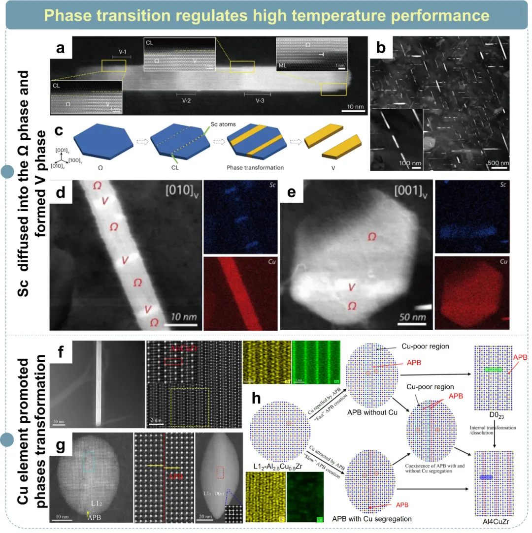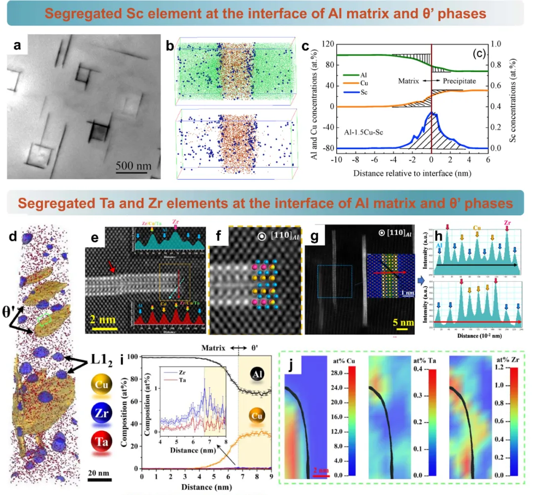 图25、(a)透射电镜图像显示Al-1.5Cu-Sc中的θ′析出相。(b)三维原子点阵图展示截面θ′析出相及铝、铜、钪原子分布。(c)θ′/基体界面处的钪偏析现象。262(d)铝-铜-锆-钽时效样品的原子位错重构。(e)红色箭头指示由协同成核形成的既有晶片与新生晶片的界面,插图为蓝色和红色线条对应的线强度分布。(f)高倍放大下,晶片尖端晶体结构重叠示意图(橙色铜、蓝色铝、品红色锆、绿色钽)。(g)θ′晶片析出相的高角角分辨STEM显微图及定量强度分布图。(h)分别对应(g)中黑色和红色线条的线强度分布。(i)θ′晶片一维成分分布图,(j)θ′晶片截面二维等高线图显示界面处铜、钽、锆元素分布。 图26、相偏聚调控高温性能的典型案例