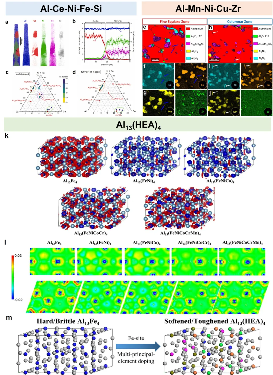 图21、(A)制备的Al-Ce-Ni-Fe-Si多组元合金的原子分布图,显示Al11Ce3和Al9(Ni,Fe)2析出相及其(b)元素分布。(c)制备态与(d) 400°C/144小时时效处理状态下的伪三元相图所示可能析出相。(e,h)铝锰镍铜锆多组元合金内部,等轴晶区与细晶区的析出相尺寸及形貌存在差异。(f,g,i,j)不同析出相颗粒对应显微图。(k)Al13Fe4型结构与Fe、Al亚晶格的电荷密度差。(l)Al13Fe4型结构与Fe、Al亚晶格在(100)晶面的电荷密度差。(m)通过铁位点多主元素掺杂实现Al13Fe4金属间化合物软化。