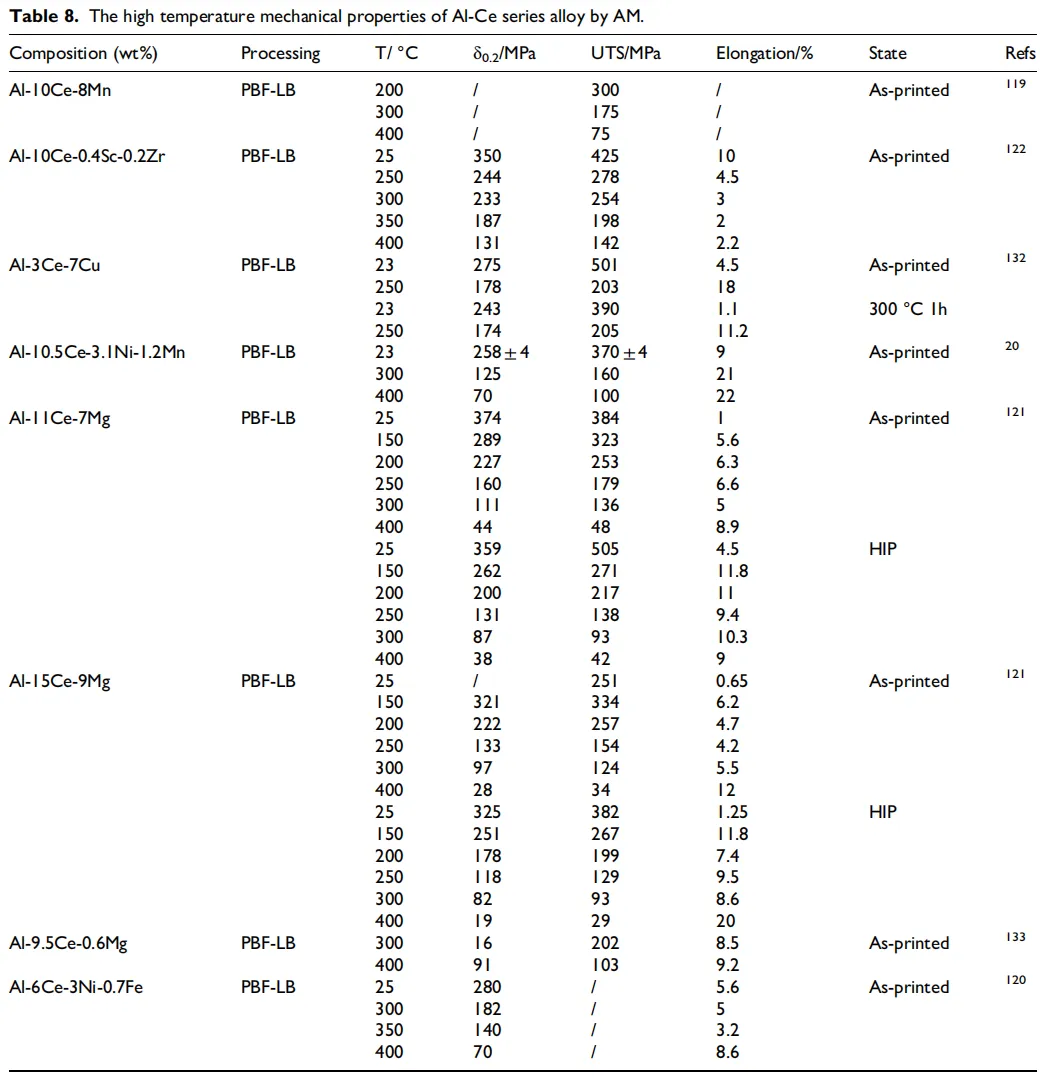 通过复合添加不同元素,实现“双稳定”“双强化”:通常通过多种稳定策略的协同作用,可显著提升材料的热稳定性。以前文提到的铝铈(Al-Ce)和铝镍(Al-Ni)合金为例,通常会添加某些合金元素形成共晶结构与析出相的双重热稳定机制。曼卡等人制备的PBF-LB Al-3Ce-7Cu合金在250°C下的抗拉强度和屈服强度分别为176±9 MPa和186± 11 MPa。其微观组织中存在细小的Al11Ce3相和Al6.5CeCu6.5共晶相,这些相态共同提升了合金在室温和高温条件下的性能。杨等人采用先进制造技术制备的Al-Ce-Sc-Zr合金展现出优异的耐热性。在细密均匀的Al11Ce3共晶相与晶粒内部L12-Al3(Sc,Zr)颗粒的协同作用下,该合金在300°C时仍能保持233 MPa的抗拉强度。由此可见,合理组合多种合金元素将为合金设计带来意想不到的效果。