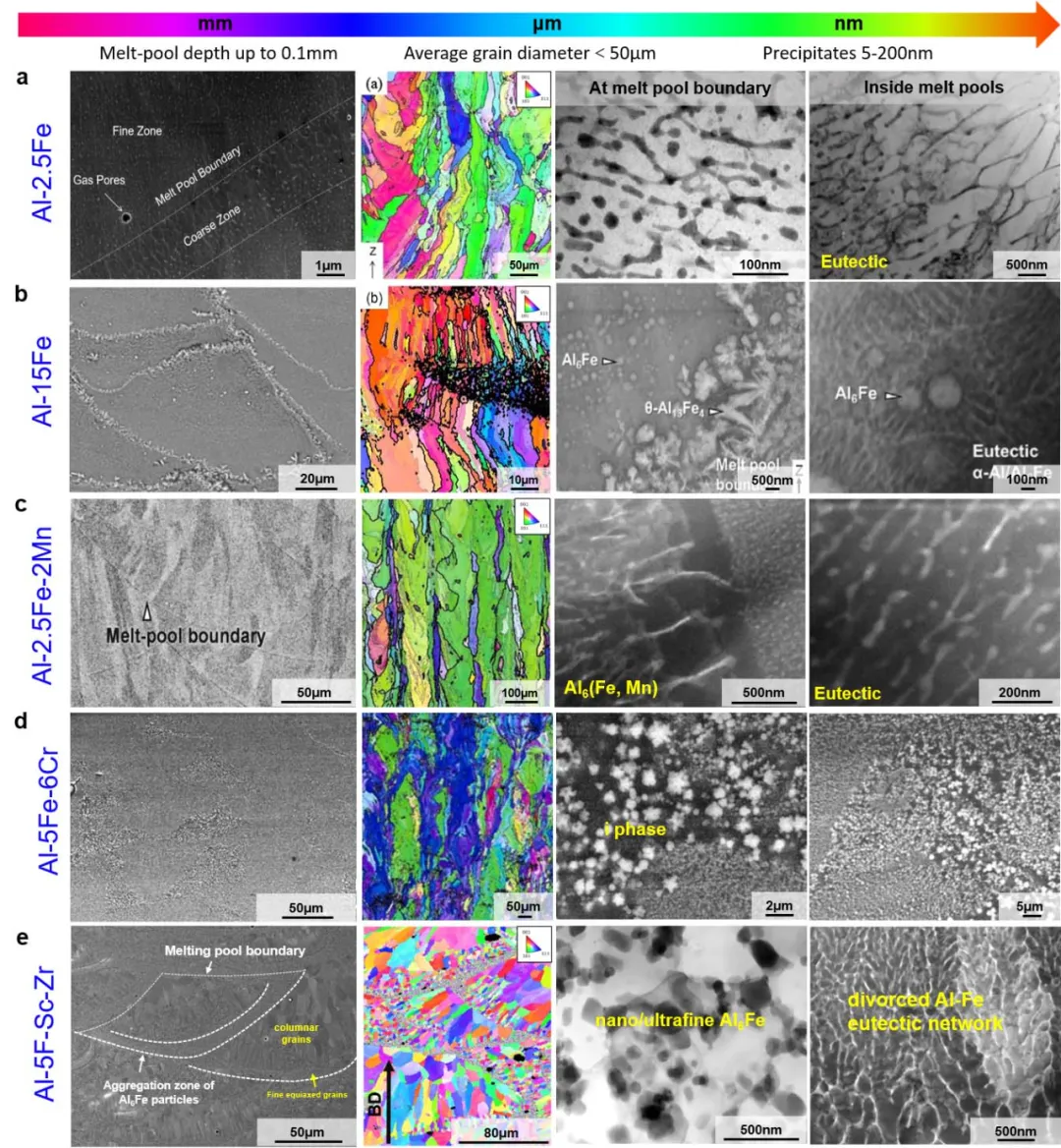 图12、展示了PBF-LB(a)Al-2.5Fe、(b)Al-15Fe、(c)Al-2.5Fe-2Mn、(d) Al-Fe-Cr以及(e) Al-Fe-Sc-Zr合金的显微组织。图中呈现了先进制造铝铁系列合金的典型熔池形态,同时展示了IPF显微图像及熔池边界或内部析出物的分布情况