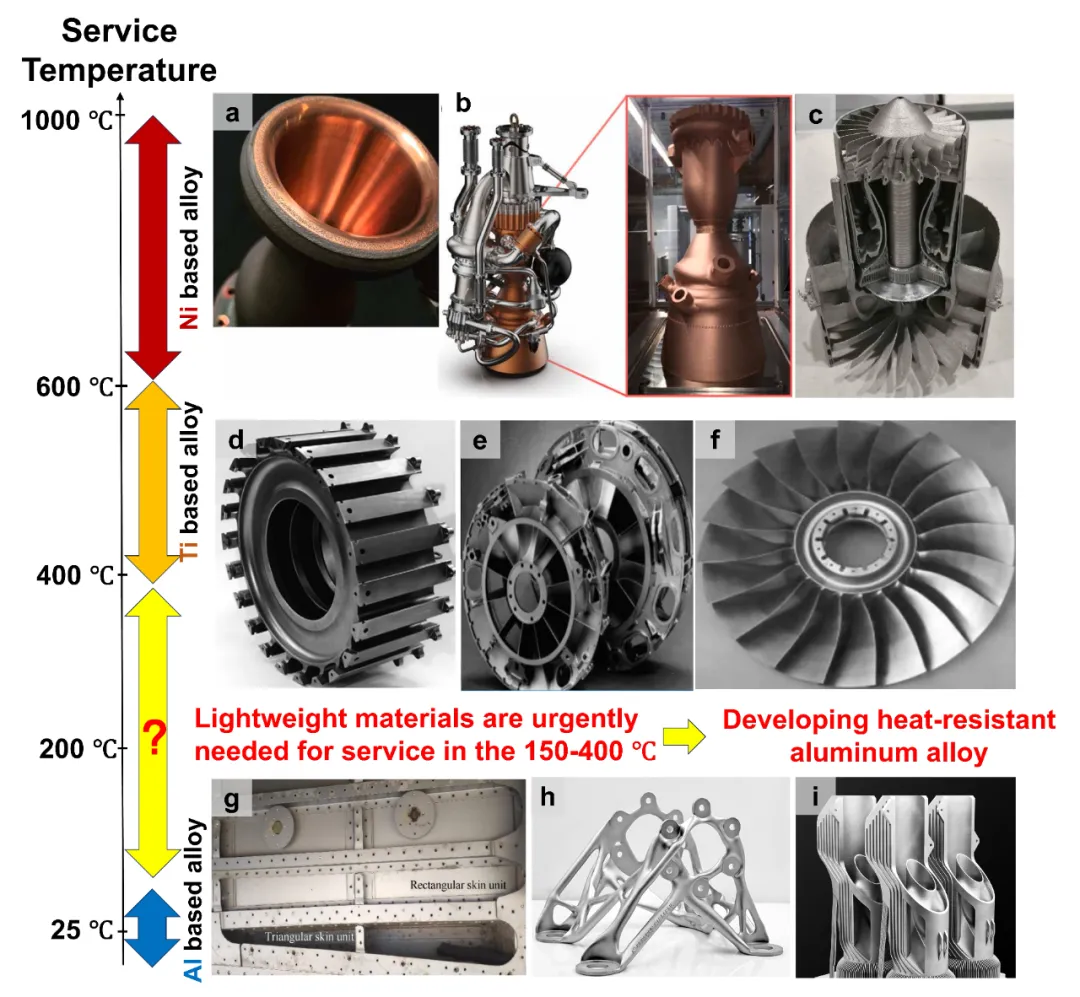 随着航天器、航空发动机等高端设备的快速发展,对具有优异高温性能的金属材料需求日益增长。这类材料需要具备“高强度、轻量化和卓越高温性能”三大特性。虽然能够承受600℃以上高温的镍基高温合金仍占主流,但市场对200-400范围(图1)的材料需求持续攀升。尽管钛合金能满足这一温度要求,但采用铝(Al)合金(密度2.7g/cm³)替代钛合金(密度4.05g/cm³)可实现约40%的减重效果,这展现出显著的轻量化优势。因此,耐高温铝合金的研发不仅有助于降低材料成本,更能推动设备轻量化进程。目前铸造、锻造和挤压仍是铝合金加工的主要工艺。然而,现代工业对复杂几何形状轻量化部件的需求不断增长,给传统加工工艺带来了严峻挑战。增材制造(AM)技术凭借其独特的逐层成型能力,实现了几何结构复杂部件的一体化制造。该技术能成功制备蜂窝结构、薄壁结构及空心部件等复杂轻量化结构。此外,增材制造技术固有的快速凝固特性能够形成超细晶粒微观结构,从而显著提升耐热铝合金的性能。在众多增材制造技术中,粉末床熔融激光束(PBF-LB)是最广泛应用的方法。由于其极高的凝固速率(约10⁷K/s),PBF-LB能进一步细化微观结构并促进高浓度强化相的析出。这一特性为提升耐热铝合金的机械性能提供了新机遇。通过打印耐热铝合金,零件可同时实现卓越的复杂结构和耐热性能。因此,增材制造用耐热铝合金已成为材料科学领域的重大研究前沿和重点攻关方向。