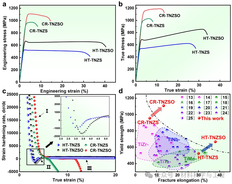 图6 不同制备条件下TNZS和TNZSO合金的室温拉伸性能。(a) 工程拉伸应力-应变曲线;(b) 真实拉伸应力-应变曲线;(c) 应变硬化率与真实拉伸应力的关系图;(d)本研究中合金的屈服强度和延伸率与参考文献中其他生物医用β-Ti合金的相应数据比较