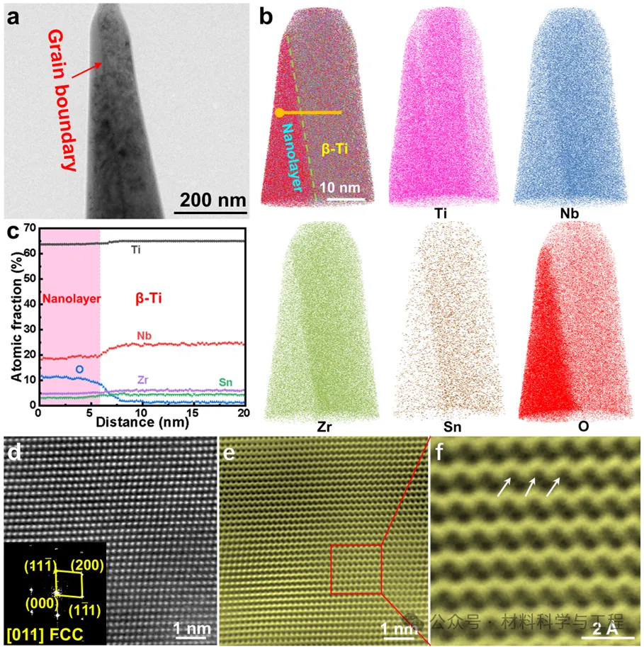 图3 HT-TNZSO合金界面纳米层的三维原子探针断层扫描和球差校正透射电镜微观结构。(a) 3D-APT实验前样品的TEM图像;(b) 使用3D-APT重构的原子图像;(c) 与图(b)中黄线对应的成分分布图;(d) 沿[011] FCC晶带轴方向的界面纳米层的STEM-HAADF图像;(e) 界面纳米层的STEM-ABF图像;(f) 图(e)中红色方框区域的放大图,显示了FCC晶体结构。白色箭头标出了FCC晶格中的氧原子柱