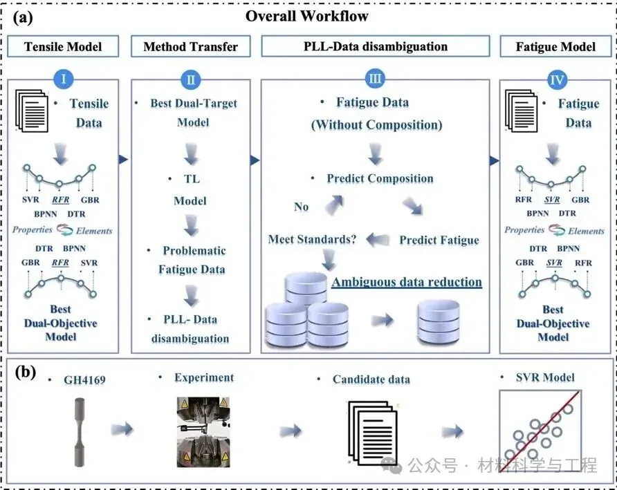 高温合金是航空航天、能源动力等国家重点领域关键装备的核心材料,其在高温高压环境下的性能预测是决定设备安全可靠性的核心指标。近年来,随着计算科学的迅猛发展,机器学习在预测高温合金性能方面取得了显著成就。例如,结合高通量实验和引入物理信息描述符的机器学习算法预测疲劳寿命,提高模型精度与解释性。然而,在材料研发与应用过程中,由于合金成分、热处理工艺等数据记录常常存在不完整或缺失的情况(即“模糊数据”),这严重制约了传统机器学习方法的预测能力。因此,如何基于这些不确定性的数据进行准确的性能预测,一直是该领域面临的一大挑战。 针对这一难题,河北科技大学苏孺教授团队联合上海交通大学、北京科技大学学者创新性地将两种机器学习技术—“迁移学习”与“部分标签学习”相结合,构建了一个能够高效处理数据不确定性的预测框架。该框架能够利用从相关材料体系中学到的通用知识,来智能地补全和修正当前数据集中缺失或模糊的关键信息。通过这一策略,该框架成功实现了从不完整的初始数据中精确“提炼”出高温合金的真实组成,基于被该框架“修正与增强”的数据,疲劳性能预测模型的准确性和泛化能力均得到了显著提升。 相关工作以题为“Data-driven fatigue prediction of superalloys: a novel strategy integrating transfer learning and partial label learning for addressing ambiguous data”研究性论文发表在《Advanced Science》。河北科技大学博士研究生吕浩鹏为论文第一作者,河北科技大学吴大勇副教授、苏孺教授、上海交通大学饶梓元副教授为论文的通讯作者。该研究成果为解决材料科学领域普遍存在的“小数据、不完整数据”问题提供了新的思路,在高性能合金的设计、服役可靠性评估等方面具有指导意义和应用前景。 论文链接: 图1. 方法论概述。a) 结合PLL与TL进行合金成分挖掘与疲劳性能预测的新型工作流程框架。该框架分为四个主要步骤:(I) 拉伸性能与成分预测;(II) TL方法;(III) PLL方法;(IV) 疲劳性能预测。b) 模型预测疲劳性能准确性的实验验证。具体步骤包括材料制备、疲劳试验、数据采集及模型验证。 图2. PLL流程图:a) 数据消歧过程示意图及每次优化循环后失效数据的演变过程;b)模型在优化周期中MAPE与R²值的变化趋势;c) 应用PLL策略前后SVR模型MAPE与R²值的对比。