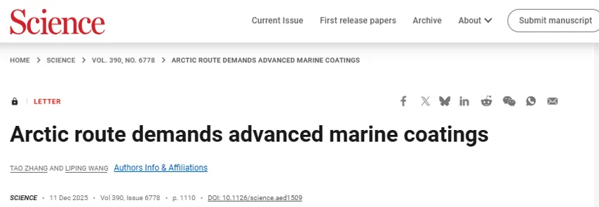 近日,中国科学院宁波材料技术与工程研究所海洋关键材料全国重点实验室张涛研究员、王立平研究员团队在国际著名学术期刊《Science》发表Letter文章。文章系统分析了中欧北极快线开通后,船舶涂料面临的极端环境挑战与生态保护压力,强调开发兼具抗极端环境能力与生态安全性的先进多功能船舶涂料的紧迫性,为北极航线的安全可持续运营提供了重要技术方向。 随着全球贸易与绿色航运的发展,北极航线凭借其独特的地理优势成为连接亚欧大陆的重要通道。2025年9月23日,中国开通中欧北极快线,将亚欧海上航程缩短至18天,较传统航线减少12-15天,不仅大幅提升货物运输效率、降低碳排放,还为拥堵的苏伊士运河提供了重要替代方案。然而,北极航线的特殊环境给船舶运营带来了严峻考验:极端极地条件、超过80°C的剧烈温度波动以及高腐蚀性海水,导致传统船舶涂料的防护效能大幅下降,难以保障船舶结构完整性;同时,北极生态系统极其脆弱,恢复速度缓慢,传统涂料降解过程中释放的微塑料、Cu2+离子等污染物,会对海洋生物造成长期危害,甚至通过食物链放大生态风险,严重威胁北极生态平衡。 研究团队指出,要应对北极航线面临的极端环境考验与生态保护压力的双重挑战,必须打破传统船舶涂料的功能边界,研发兼具防冰、耐磨、防污、防腐多重核心功能的先进多功能材料。具体来看,有机-无机杂化复合材料、可动态响应外界环境的智能调节涂料以及无毒防污表面材料,成为兼顾船舶防护与生态保护的潜在方案。文章强调,目前国际上缺乏针对北极航道复杂环境的系统化涂层评价标准,亟需建立能够综合模拟冰冲击、冷热循环和腐蚀协同作用的专用测试系统,以加速材料从实验室走向工程应用。研究团队进一步指出,跨学科协作是推动此类先进涂料研发的关键,只有整合材料科学、环境科学、船舶工程等多领域技术力量,才能打造出适应北极航道复杂环境的高性能、生态友好型涂料,为北极航线船舶的安全服役与可持续发展提供核心支撑。 北极航线的战略价值与潜在经济效益巨大,其可持续运行依托于高性能海洋防护材料的突破。此次在 Science 的发表强调了极地航运时代对材料科学的新需求,呼吁全球材料科学、海洋工程与环境科学领域开展跨学科合作,共同推动极地环境下的材料创新。 相关成果 Science Arctic route demands advanced marine coatings DOI: 10.1126/science.aed1509