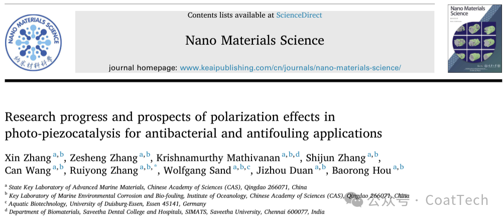 一段话总结:该综述聚焦光压电催化技术在海洋抗菌防污领域的研究进展,指出传统防污方法存在高成本、污染及耐药性问题,而光催化受限于光依赖和复杂海洋环境干扰;光压电催化通过耦合压电效应与光催化,在机械应力(超声、水流等)下产生内建电场(IEF),促进光生载流子分离,生成活性氧(ROS)实现高效抗菌防污,重点介绍了钛酸钡(BaTiO₃)、过渡金属硫族化合物(TMDs)、金属有机框架(MOFs)、氧化锌(ZnO)及新兴二维材料等催化材料,阐述了形貌调控、缺陷工程、异质结构建等性能增强策略,并分析了当前弱刺激响应差、实际环境适应性不足、金属泄漏风险等挑战及未来研究方向。 文章总体思维导图 化学方法(如含铜涂料)易导致二次污染,且会诱导细菌产生耐药性; 物理方法(如机械清理)成本高、效率低,难以持续作用; 生物方法(如释放抗菌酶)稳定性差,易受海洋环境干扰。 光依赖性强: 黑暗(夜间)或光照不足(如遮蔽、波浪干扰)时失效; 环境干扰大: 高盐海水(Cl⁻、SO₄²⁻ scavenge ROS)、溶解有机物(竞争光子与 ROS)、温度波动(低温活性降、高温加速材料腐蚀)均会降低性能。 为此,光压电催化技术被提出,其通过耦合压电效应与光催化,利用机械能量(如超声、水流、潮汐)辅助光催化,构建多物理场驱动系统,解决单一光依赖问题,提升复杂环境适应性。 促进光生载流子(e⁻-h⁺对)分离: 在 IEF 驱动下,e⁻与 h⁺向相反方向迁移,显著抑制复合(传统光催化载流子复合率高,是效率瓶颈); 调控能带结构: 极化电荷积累会导致催化剂表面能带弯曲,动态调节异质结界面的电荷转移方向;同时,压电极化诱导的能带倾斜可匹配目标反应的 redox 电位,突破热力学限制。 e⁻还原溶解氧(O₂)生成超氧自由基(・O²⁻); h⁺氧化水分子(H₂O)生成羟基自由基(・OH); 后续反应中,・O²⁻与质子(H⁺)歧化生成过氧化氢(H₂O₂),光敏剂激发还可产生单线态氧(¹O₂)。 这些 ROS 具有强氧化性,通过以下方式实现抗菌防污: 破坏细菌细胞膜 / 细胞壁,导致胞质泄漏; 氧化 intracellular 成分(如 DNA、蛋白质、脂质),阻断代谢通路; 机械应力(如超声)引发的空化效应: 液体中微气泡交替膨胀 - 破裂,释放微射流和冲击波,对细菌细胞壁产生剪切力,辅助 ROS 杀菌,且高温(气泡破裂局部高温)可使蛋白质变性、酶失活。 压电-光催化抗菌与防污作用机制示意图 4.1 主要材料分类及特性 5.1 现存核心挑战光压电催化中极化效应在抗菌防污应用中的研究进展与展望